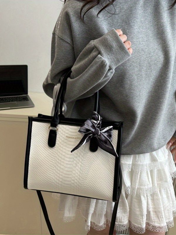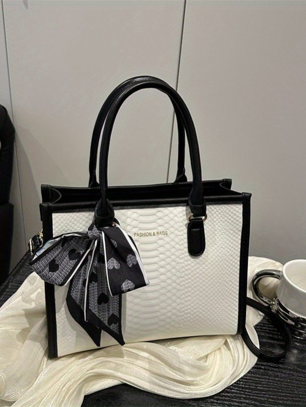 Women's Large Capacity Tote Bag - Multi-Color (Beige/Black/Red/Navy/Khaki) Convertible Crossbody/Handbag with Detachable Strap, Golden-Tone Hardware & White Bow-like Accent - Elegant, Commuting, Travel & Everyday Purse