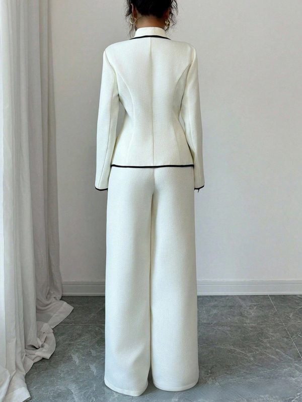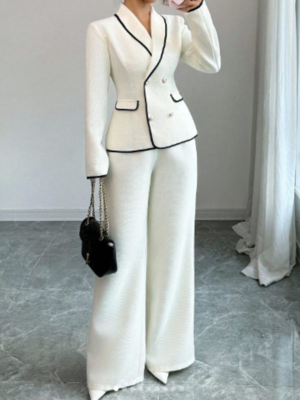 Women'S Elegant White Two-Piece Suit Set - Structured Jacket & Wide-Leg Pants with Contrast Trim, Office to Formal Events, Professional Workwear