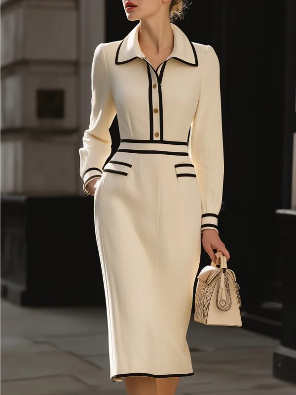 Women'S Structured Fitted Shirt Collar Dress with Black Trim & Waist Ruching - Elegant White Pencil Dress for Office, Formal Events & Social Occasions, Tailored Fall/Winter Outfits, Versatile Professional to Semi-Formal Attire
