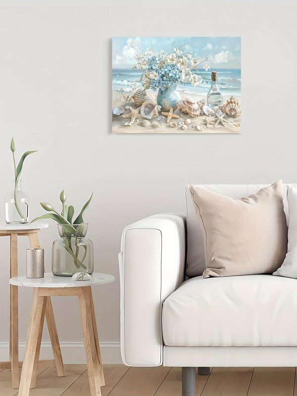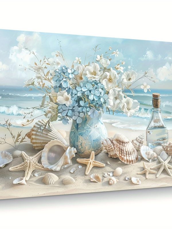 1 Piece Framed Wooden Canvas Painting, One Piece Blue Vase Floral Canvas Print, Wooden Frame Wall Art, Shell And Ocean Theme, Home And Office Decor, Suitable For Living Room, Bedroom, Kitchen, School