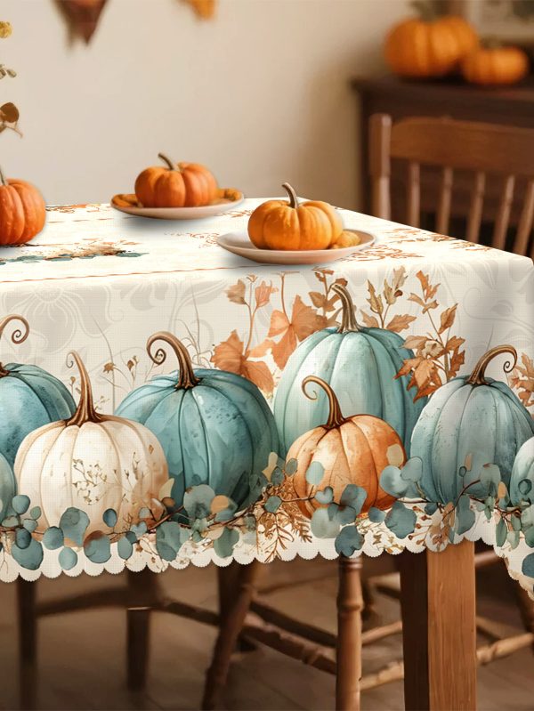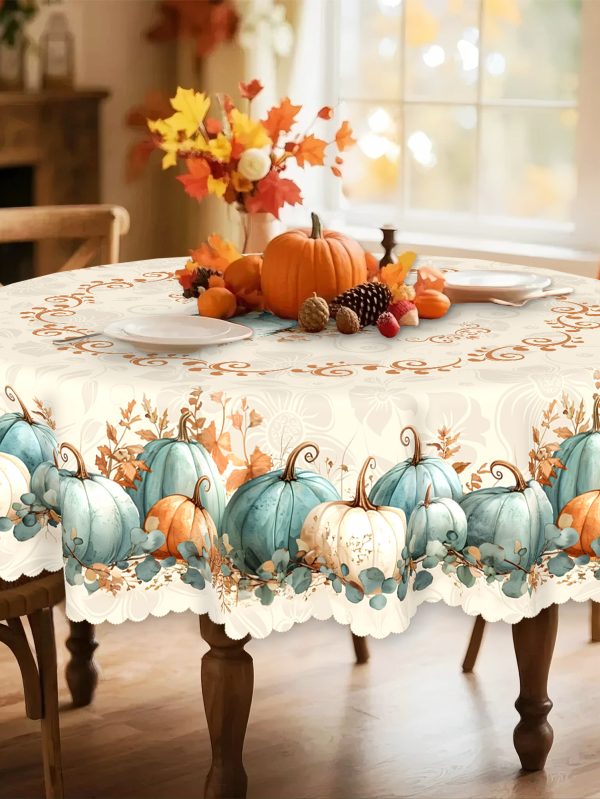 [Vintage Pumpkin & Fall] Vintage Pumpkin & Fall Leaves Tablecloth - Farmhouse Thanksgiving Dining Decor with Pumpkin Patterns in Blue, Orange, White, Beige, Teal - Durable Polyester Table Cover for Harvest Party, Autumn Home Decoration - Sizes: Rectangular, Round, Oval - Easy-Clean Table Setting, Thanksgiving Table Decor, Festive Lace Accents, Easycare Material, Holiday Hosts