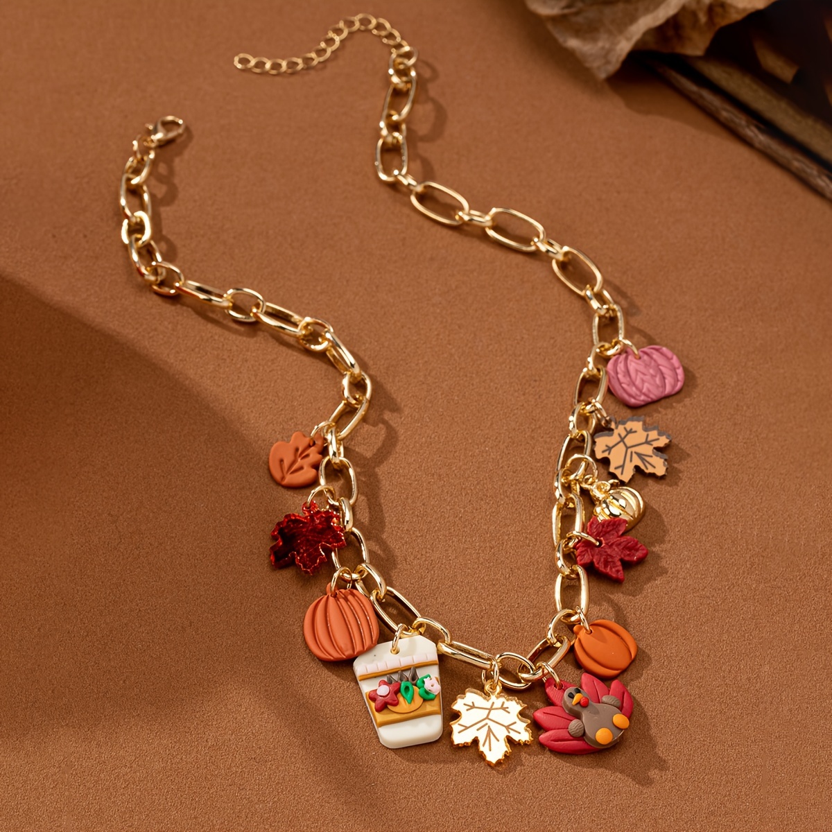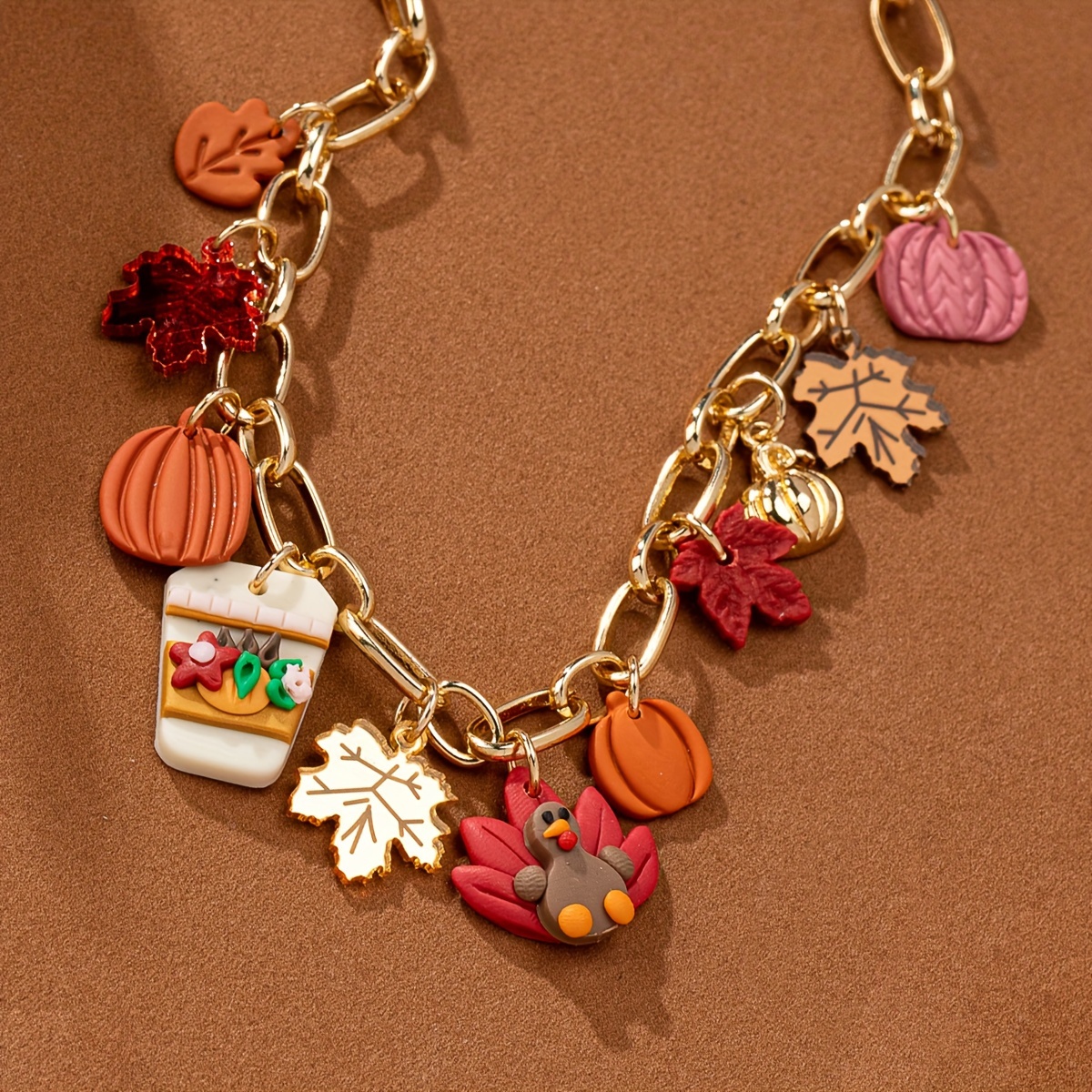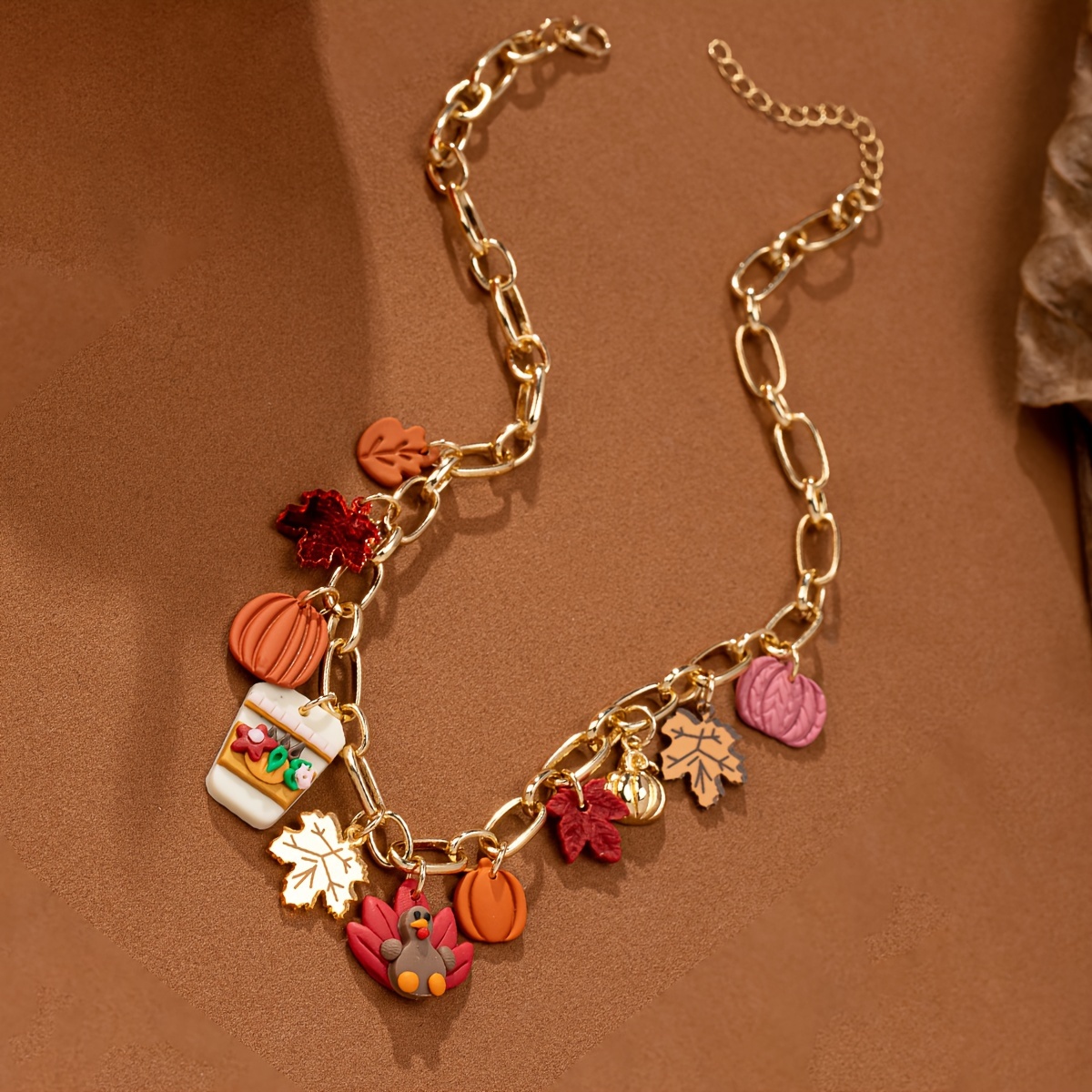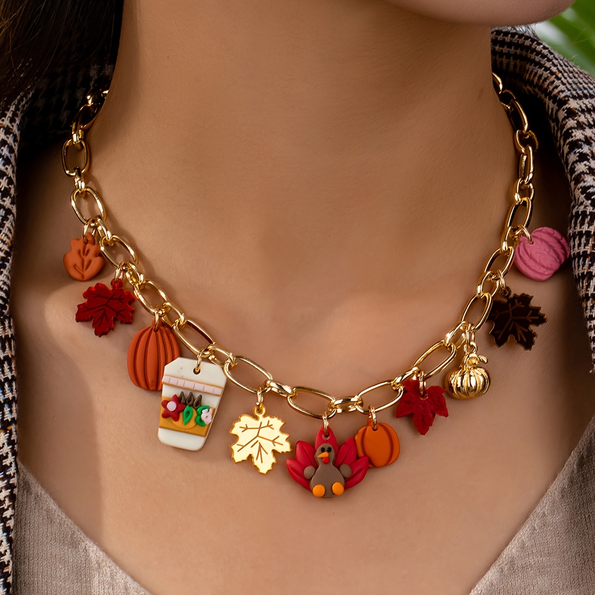 [1 Pc Thanksgiving Necklace] Autumn Thanksgiving Pumpkin Turkey Maple Leaf Charms Necklace – Soft Ceramic Jewelry, No Plating, Party & Sexy Style, Ideal for Fall Celebrations & Gift-Giving, 1 Pc