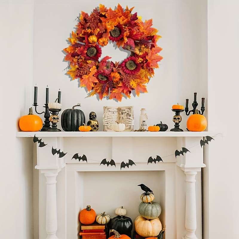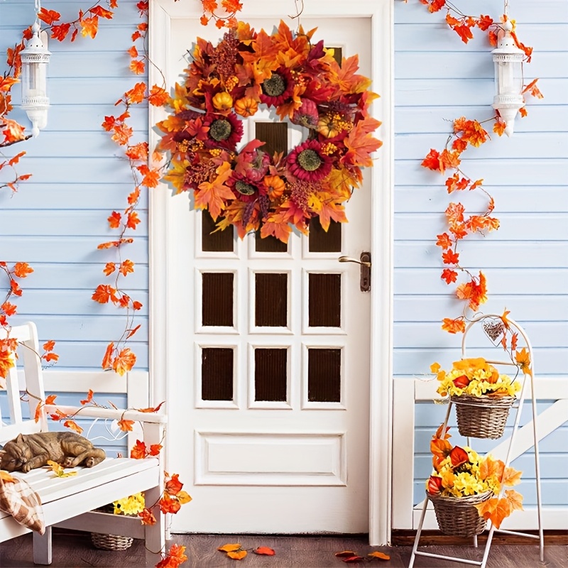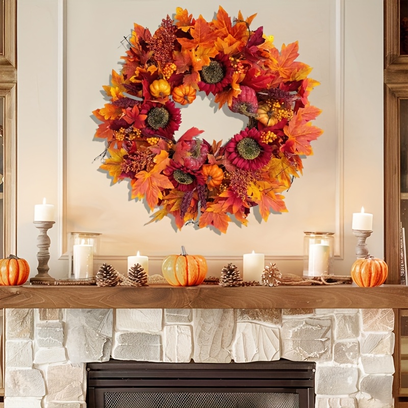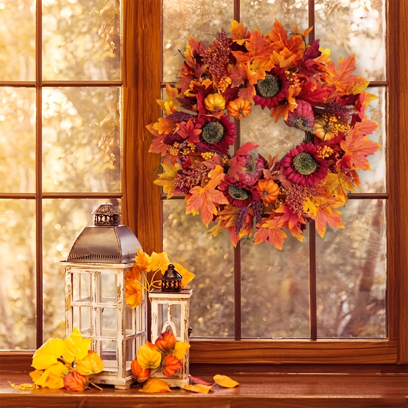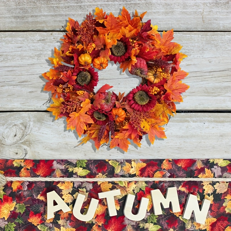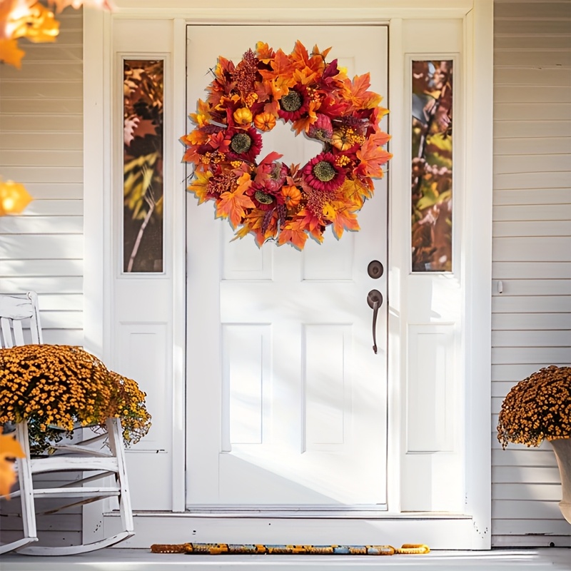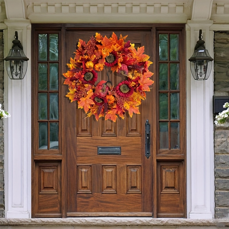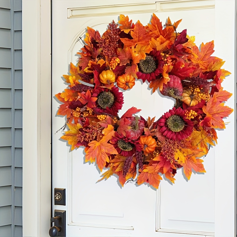 24″ Fall Decorations For Home, Autumn Wreaths With Artificial Maple Leaves Fake Pumpkins Faux Acorns Sunflower, For Indoor Outdoor, Farmhouse Wall Thanksgiving Day Harvest Festival Decor, Halloween Party Decorations