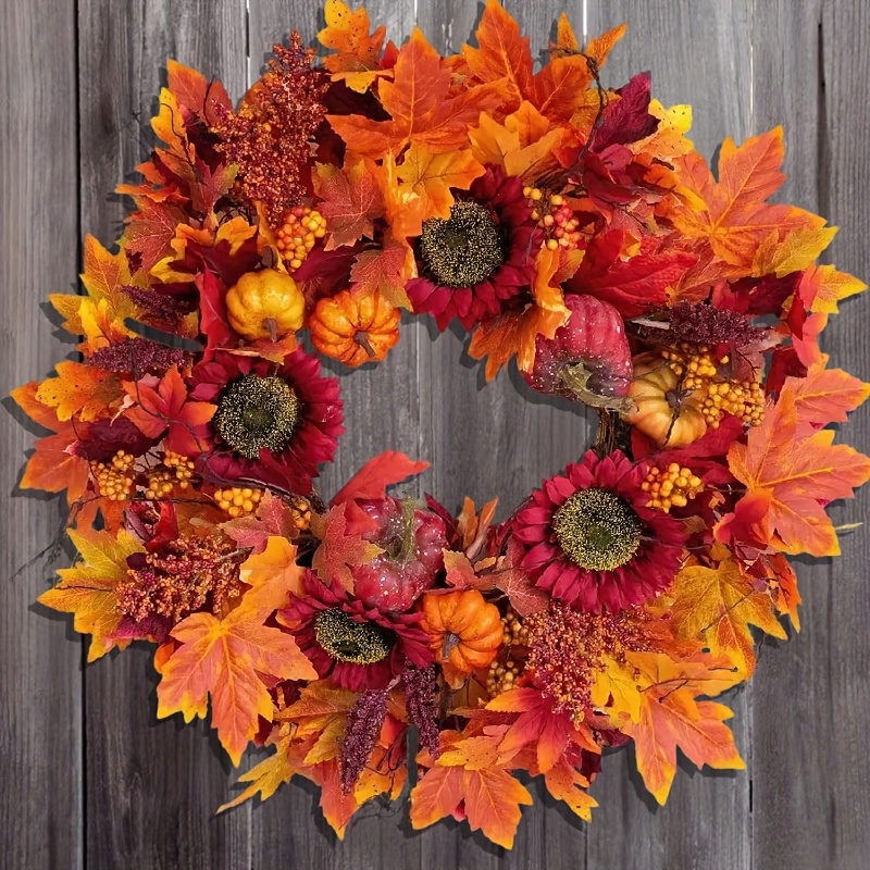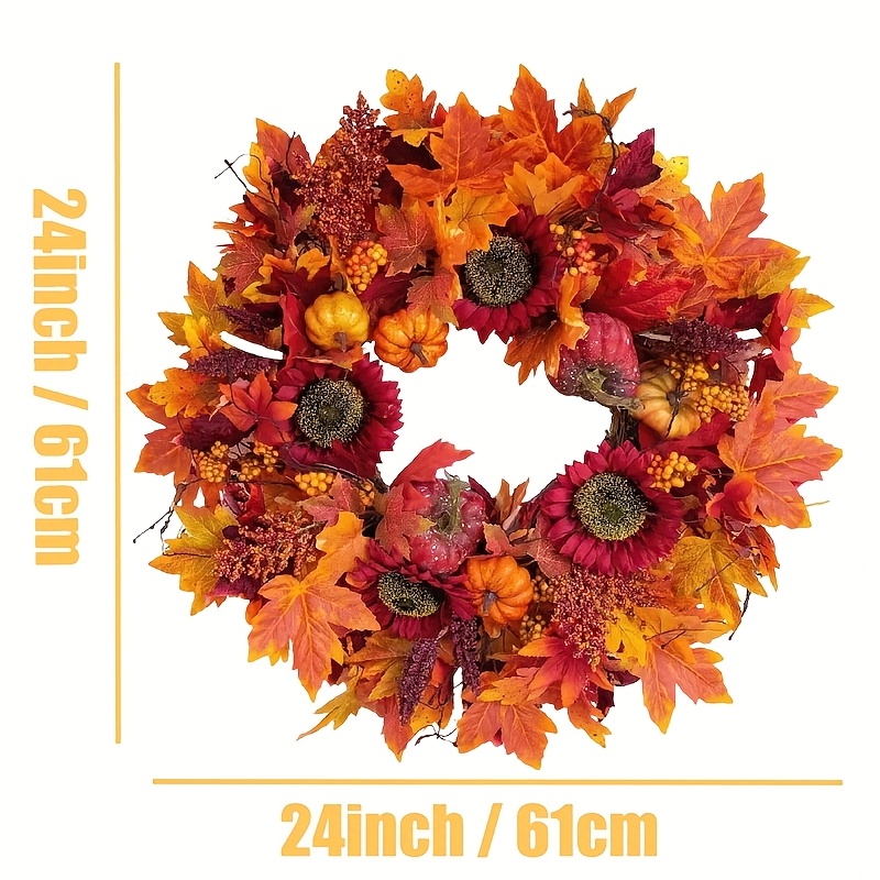 Home/Thanks Giving/24″ Fall Decorations For Home, Autumn Wreaths With Artificial Maple Leaves Fake Pumpkins Faux Acorns Sunflower, For Indoor Outdoor, Farmhouse Wall Thanksgiving Day Harvest Festival Decor, Halloween Party Decorations