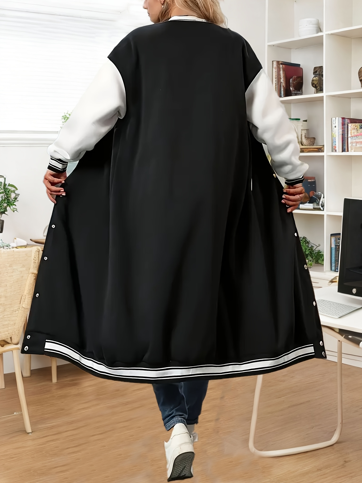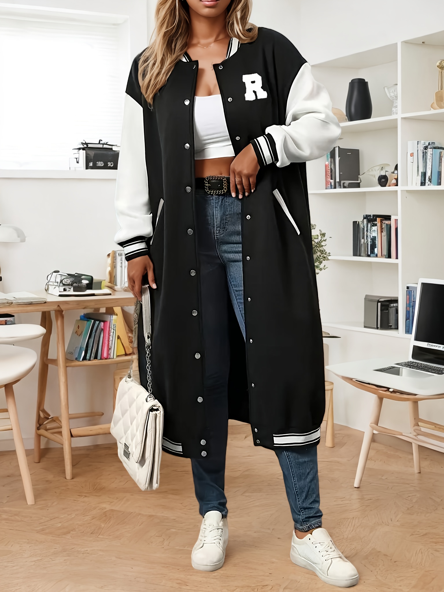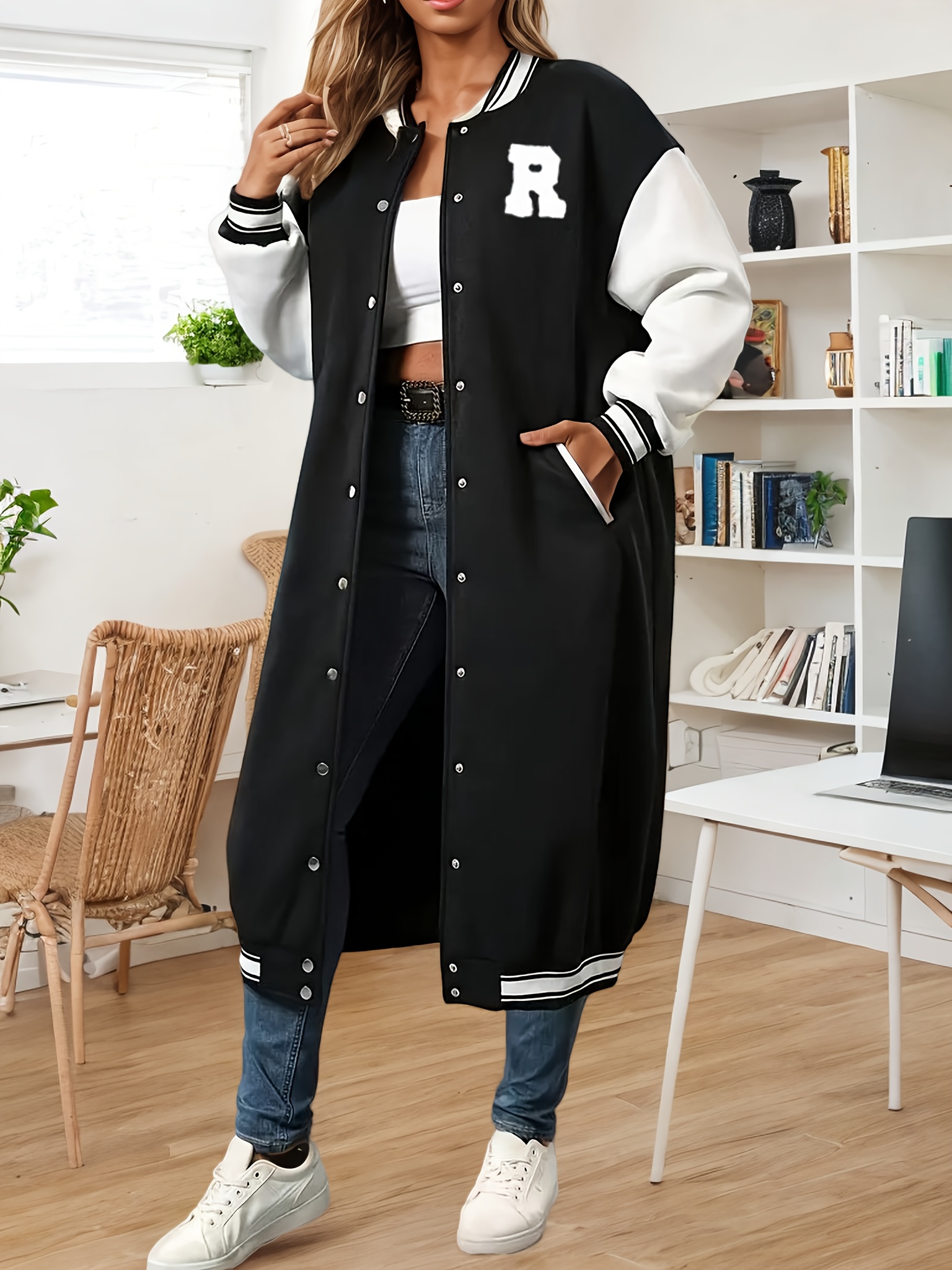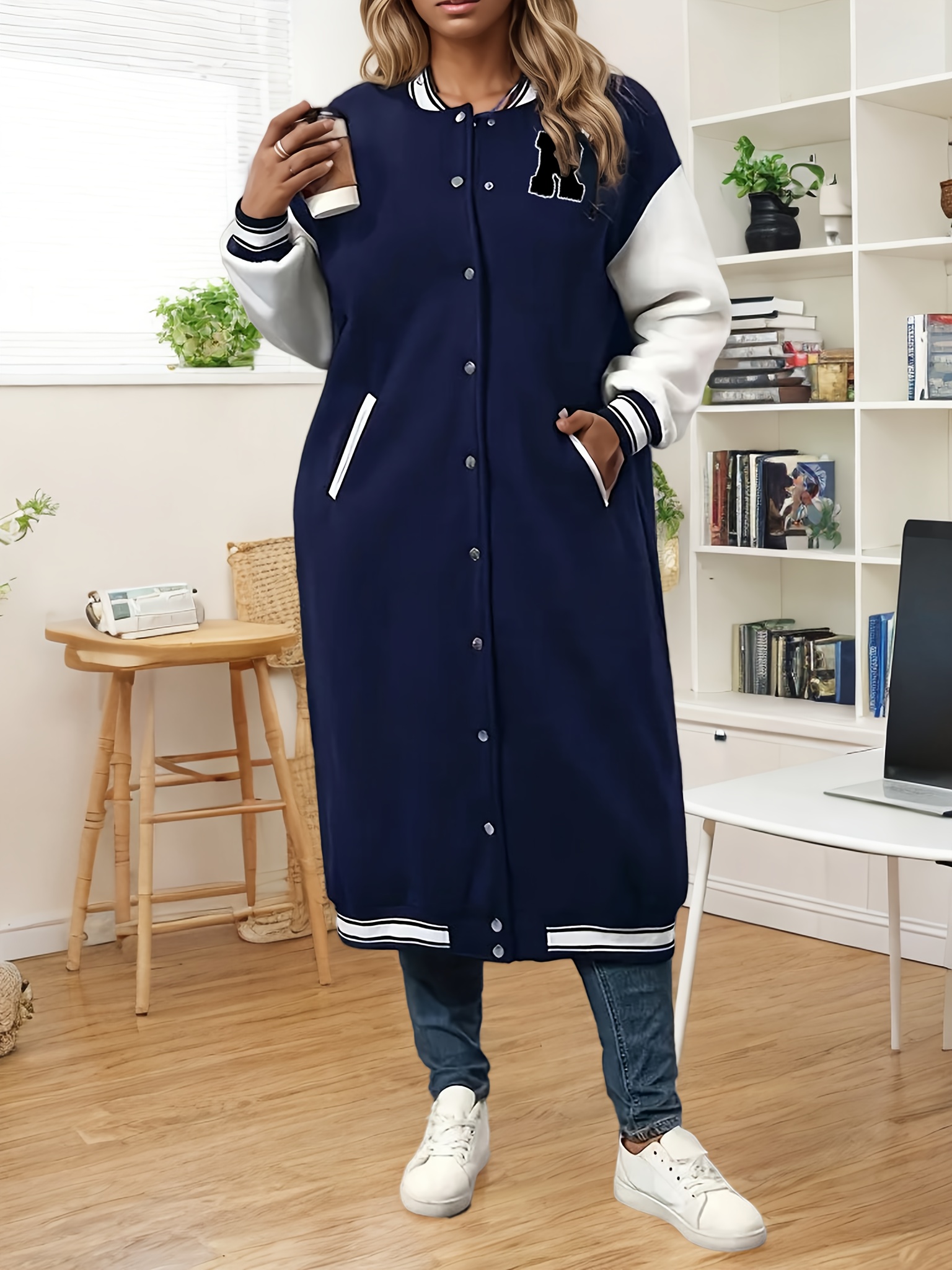 [Chic Embroidered Hoodie] Chic Embroidered Colorblock Hoodie Jacket | Longline Cozy Coat For Women – 3-Season Urban Style (Spring, Fall, Winter) With Tailored Silhouette & Bold Contrast Button-Up Windbreaker
