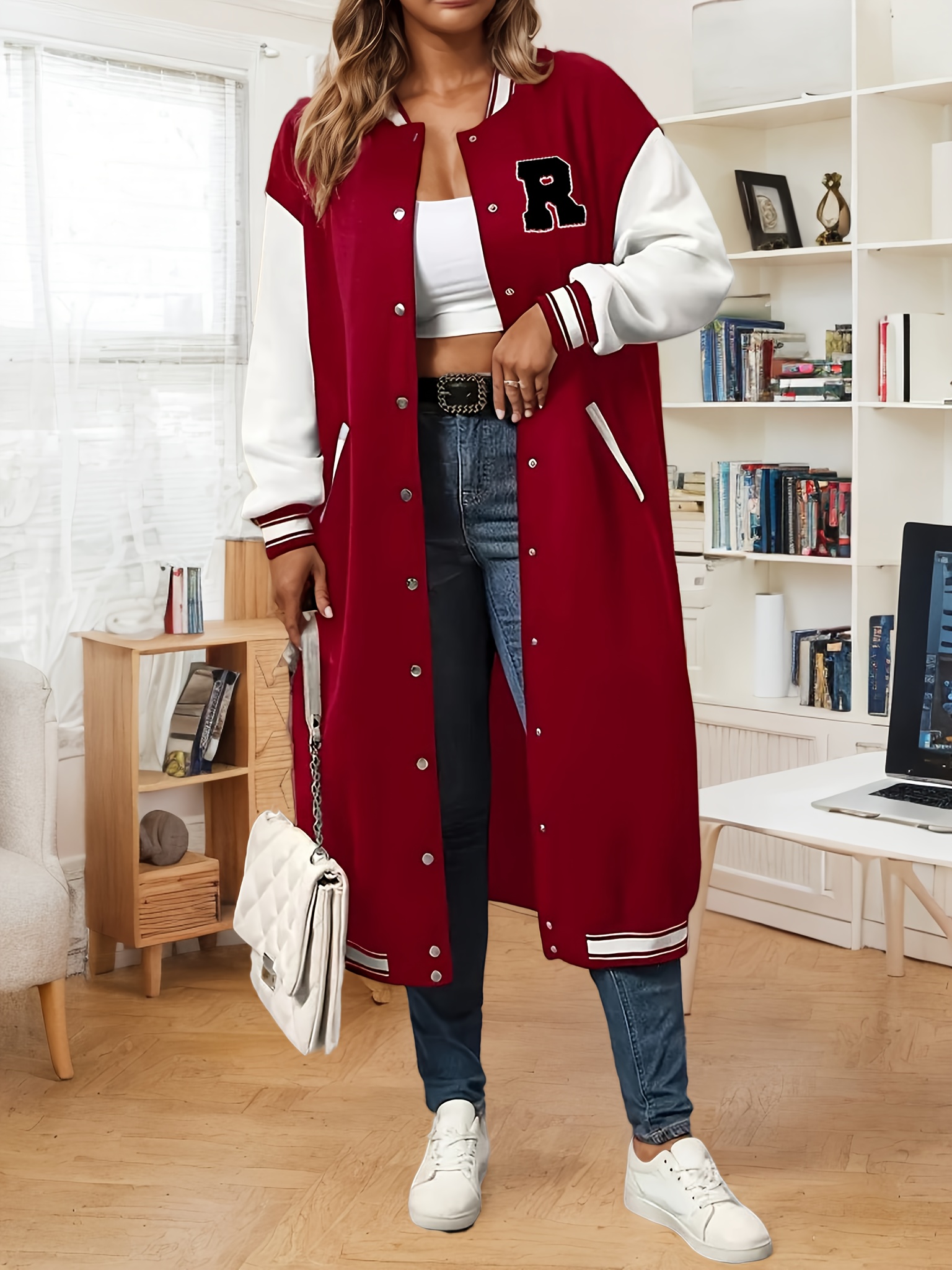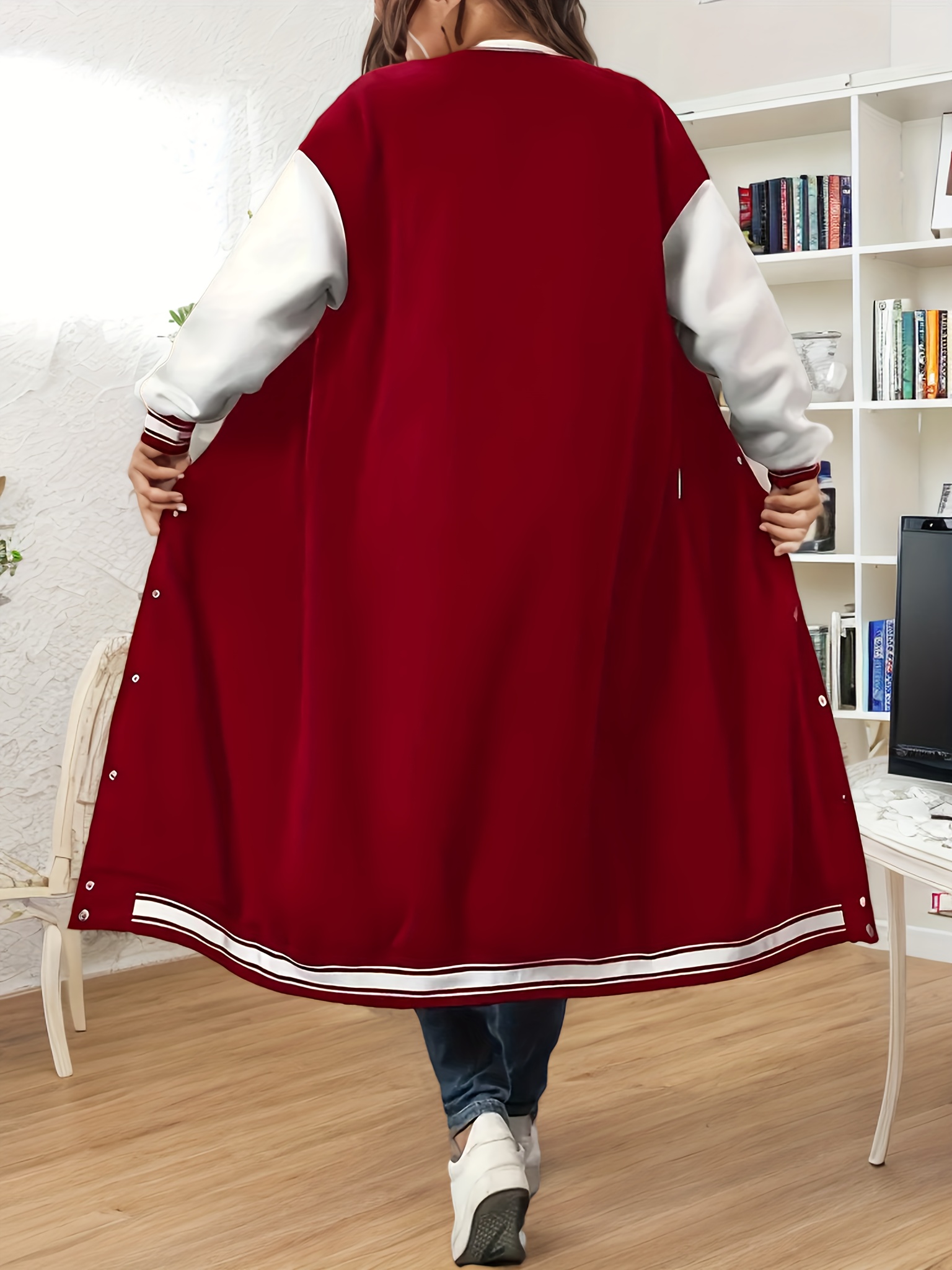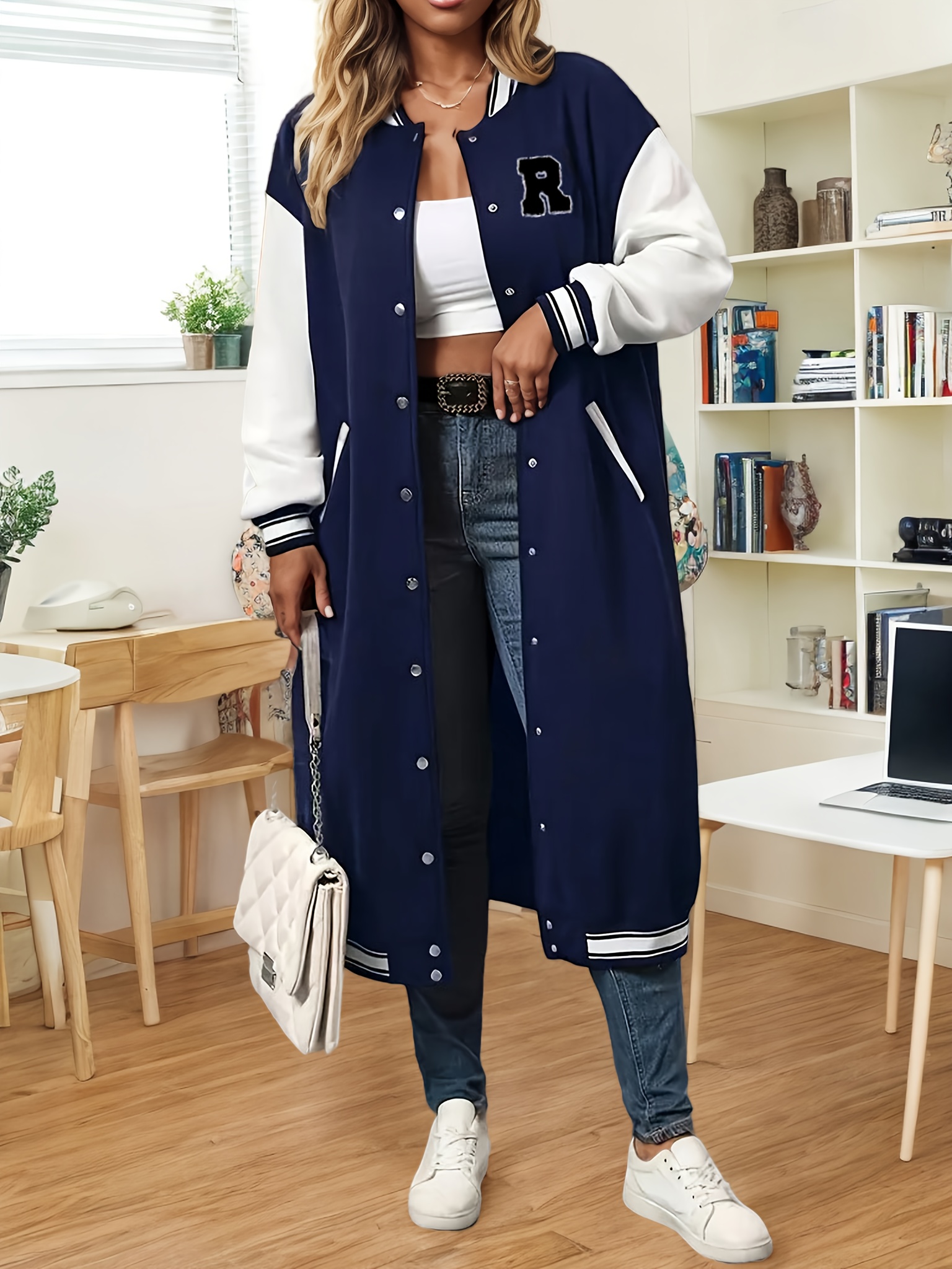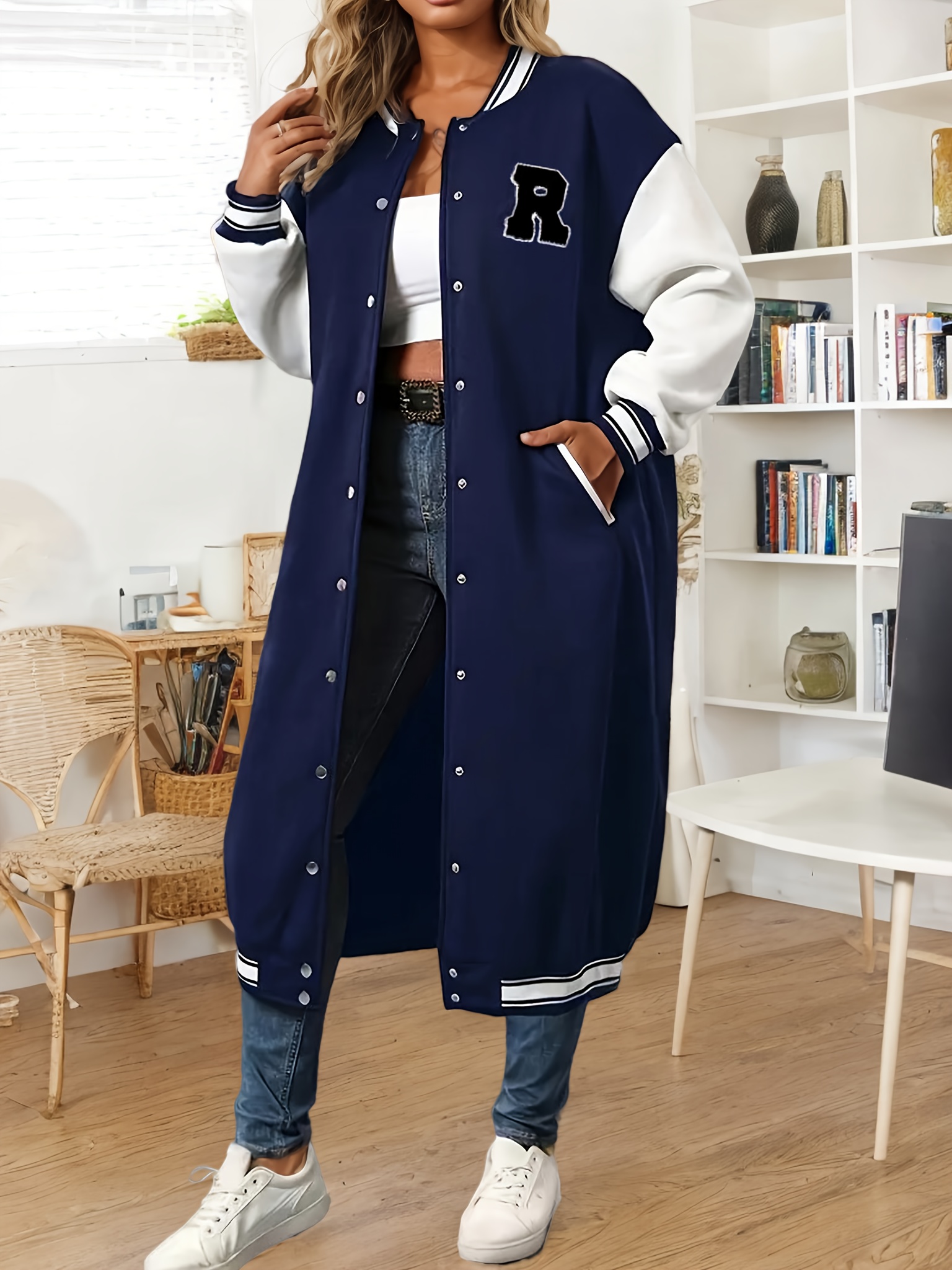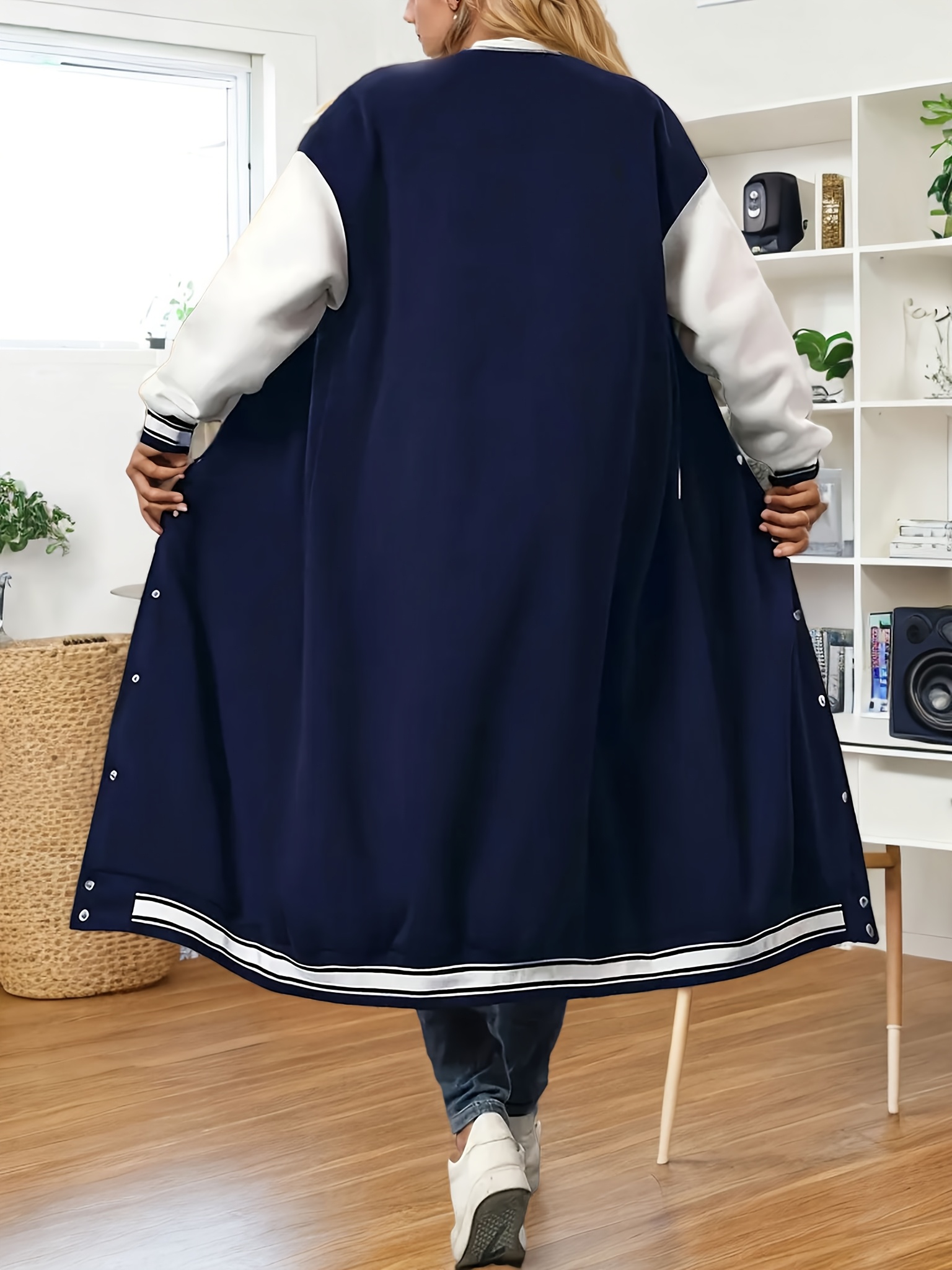 [Chic Embroidered Hoodie] Chic Embroidered Colorblock Hoodie Jacket | Longline Cozy Coat For Women – 3-Season Urban Style (Spring, Fall, Winter) With Tailored Silhouette & Bold Contrast Button-Up Windbreaker