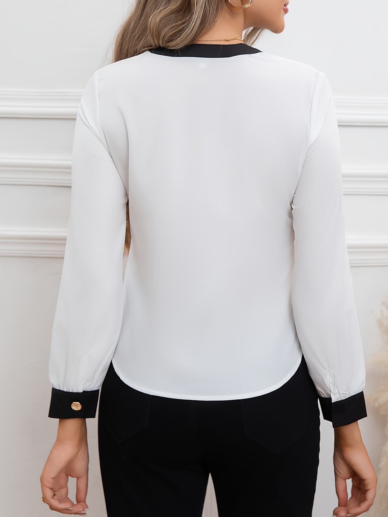 [Elegant, Color Block Blouse] Elegant Color Block Notched Neck Blouse | Long Sleeve Women’s Clothing for Spring & Fall