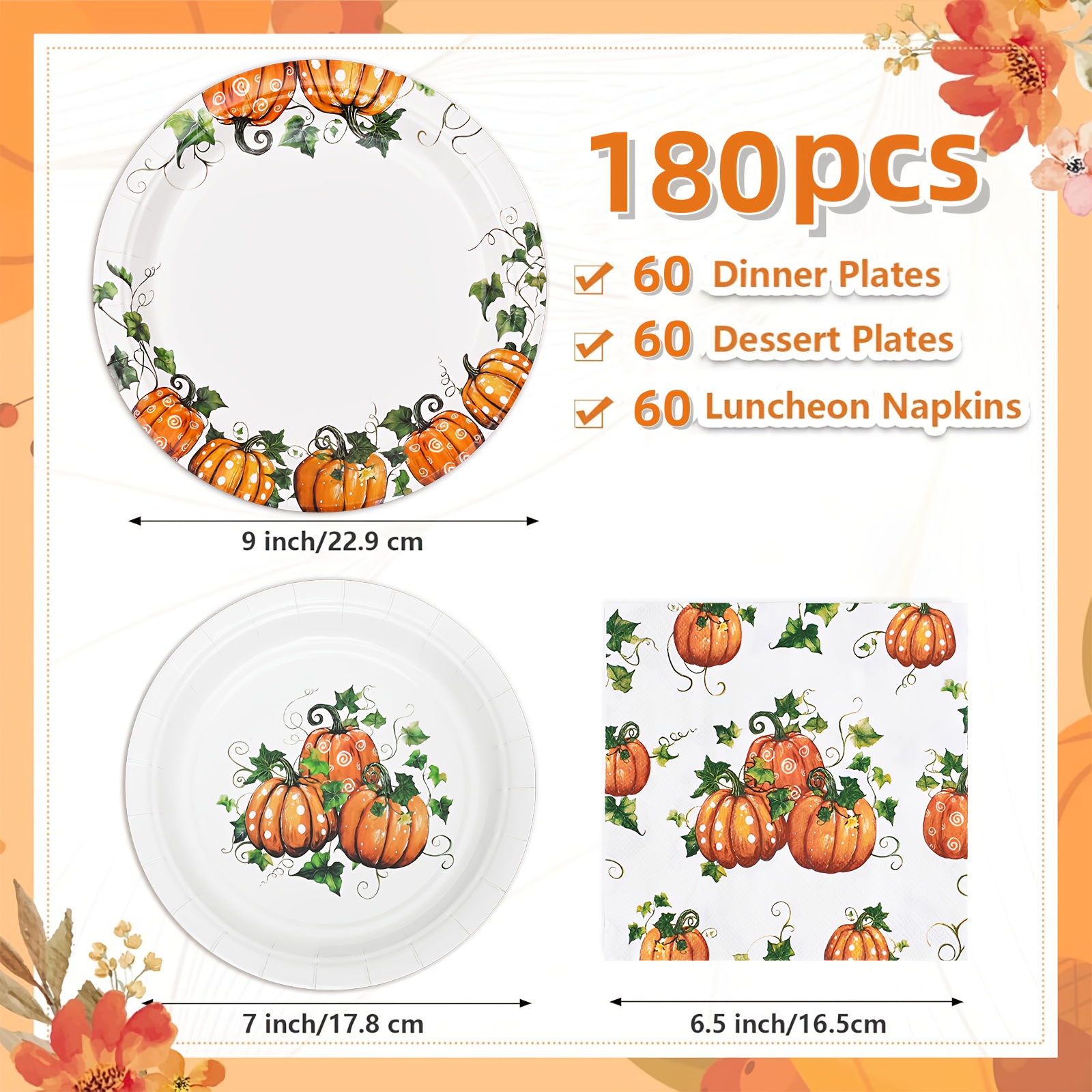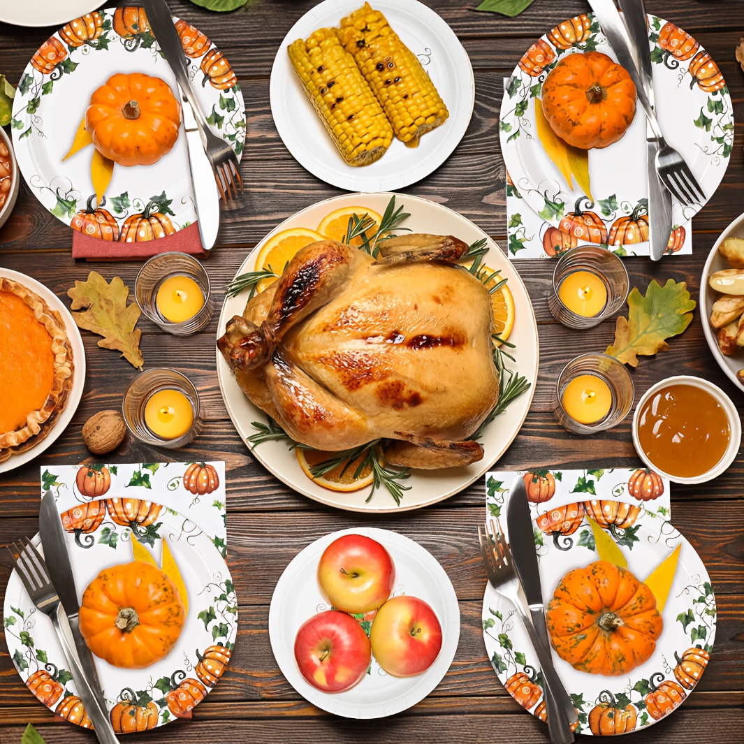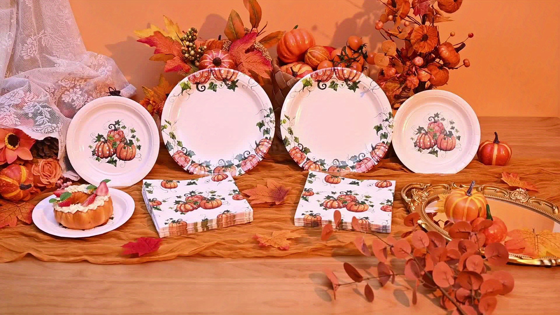 Fall Pumpkin Thanksgiving Autumn Harvest Party Disposable Tableware(60/180/300pcs), Christmas, For Wedding Birthday Celebration, Holiday Party Cartoon Vintage Decoration Set (7in Dessert Plates+9in Dinner Plates+napkins).