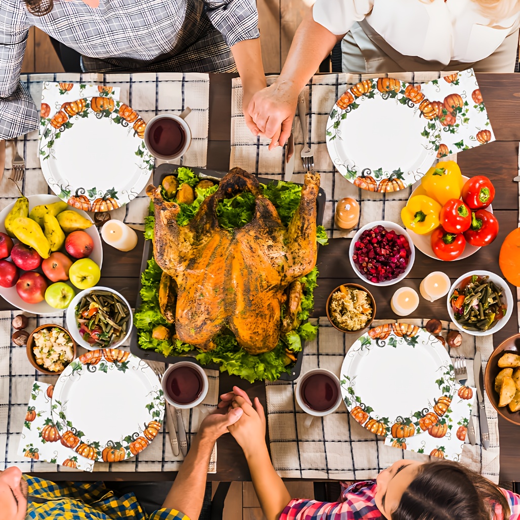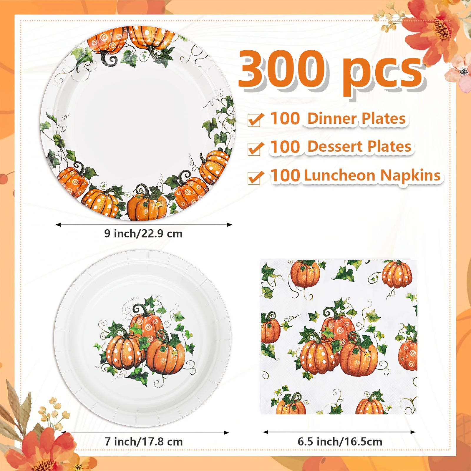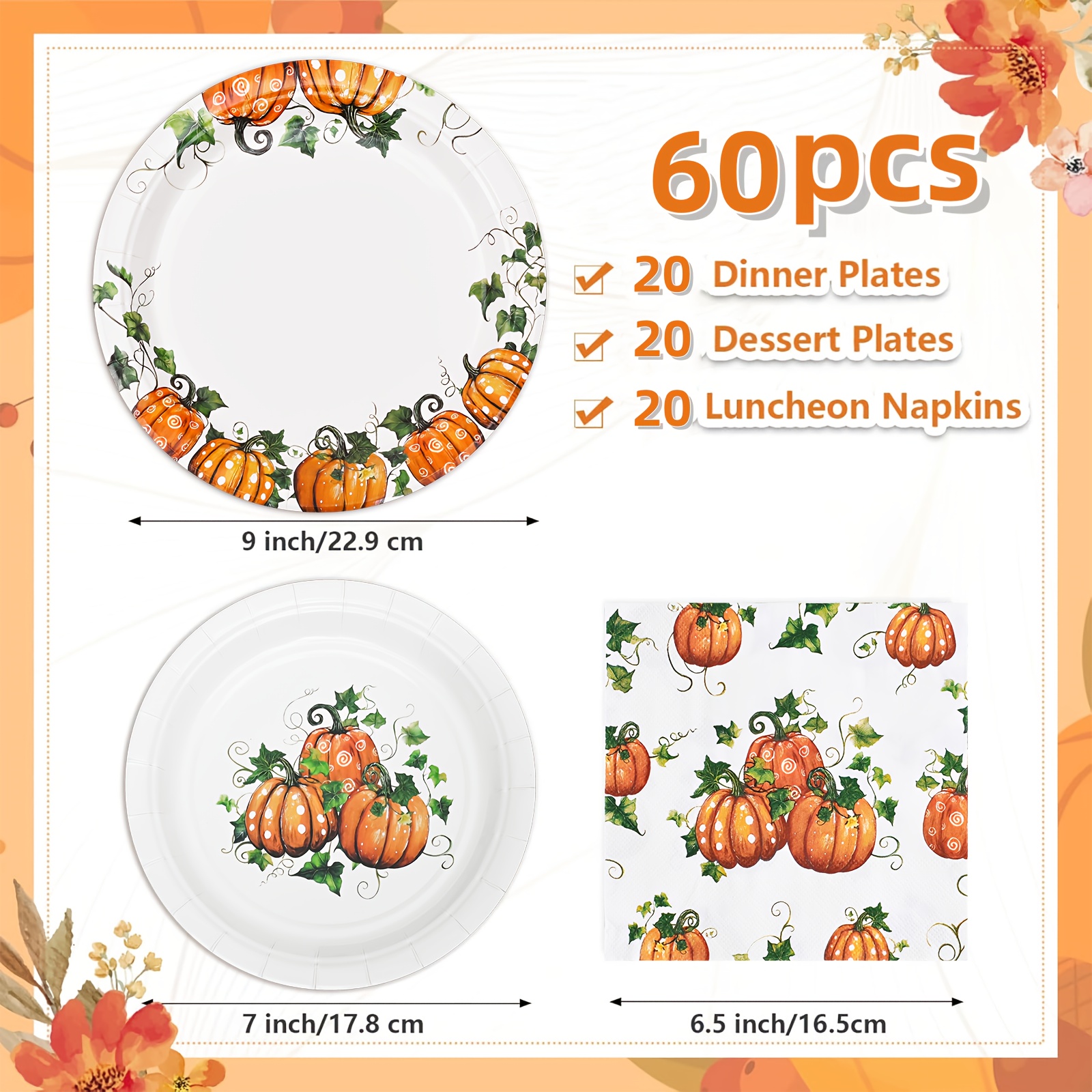 Fall Pumpkin Thanksgiving Autumn Harvest Party Disposable Tableware(60/180/300pcs), Christmas, For Wedding Birthday Celebration, Holiday Party Cartoon Vintage Decoration Set (7in Dessert Plates+9in Dinner Plates+napkins).