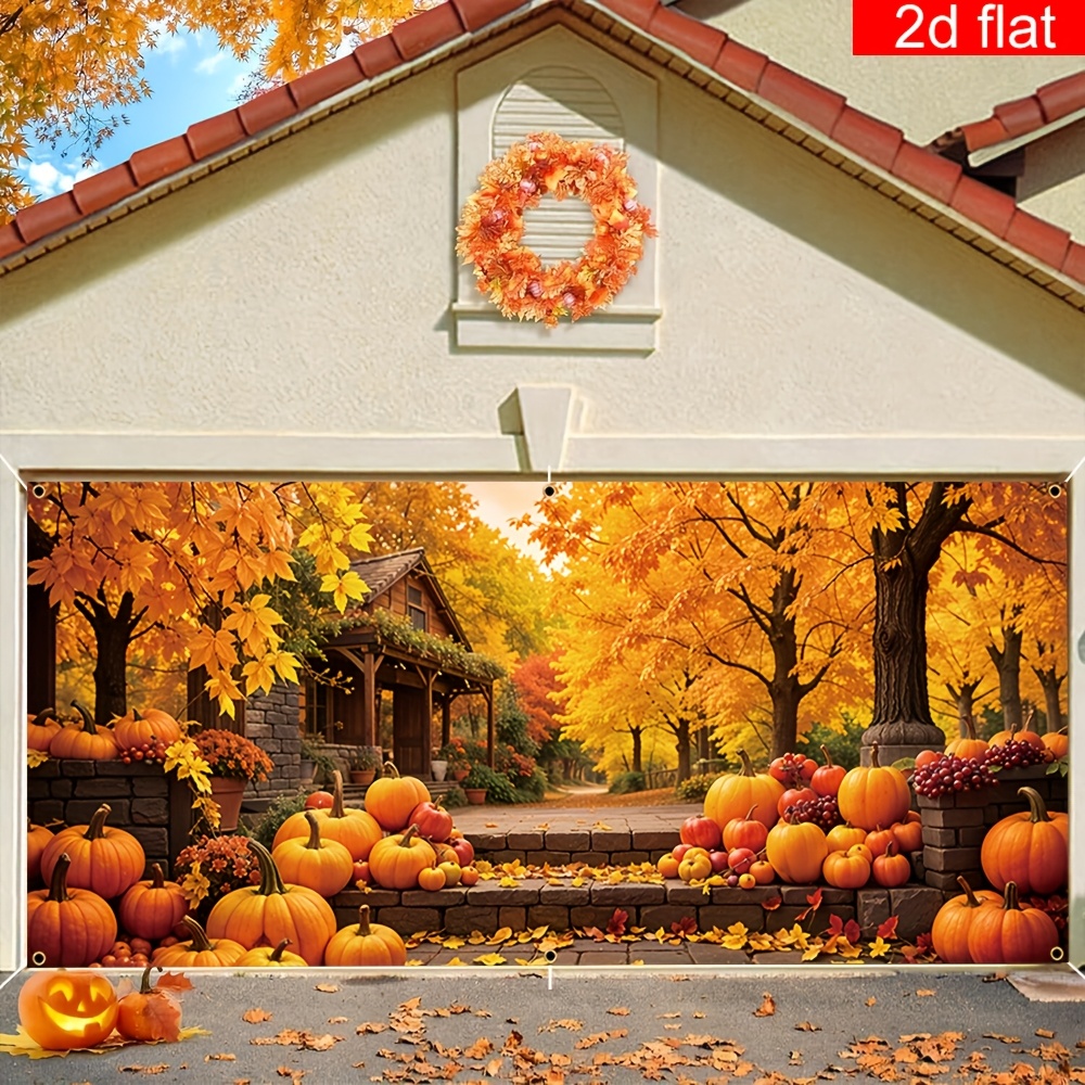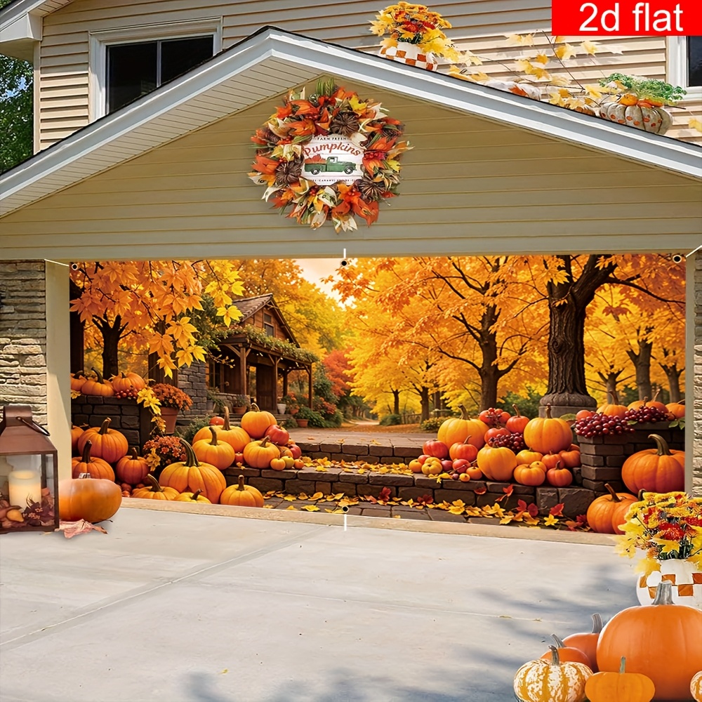 [Halloween & Thanksgiving] 1pc Large Autumn Harvest Garage Door Banner – Vibrant Fall Foliage with Pumpkins & Maple Leaves, Durable Vinyl Thanksgiving Decoration for Outdoor/Indoor Use, Easy to Install with Adhesive Strips (No Batteries/Electricity), Seasonal Door Cover for Halloween & Thanksgiving Parties, 2D Flat