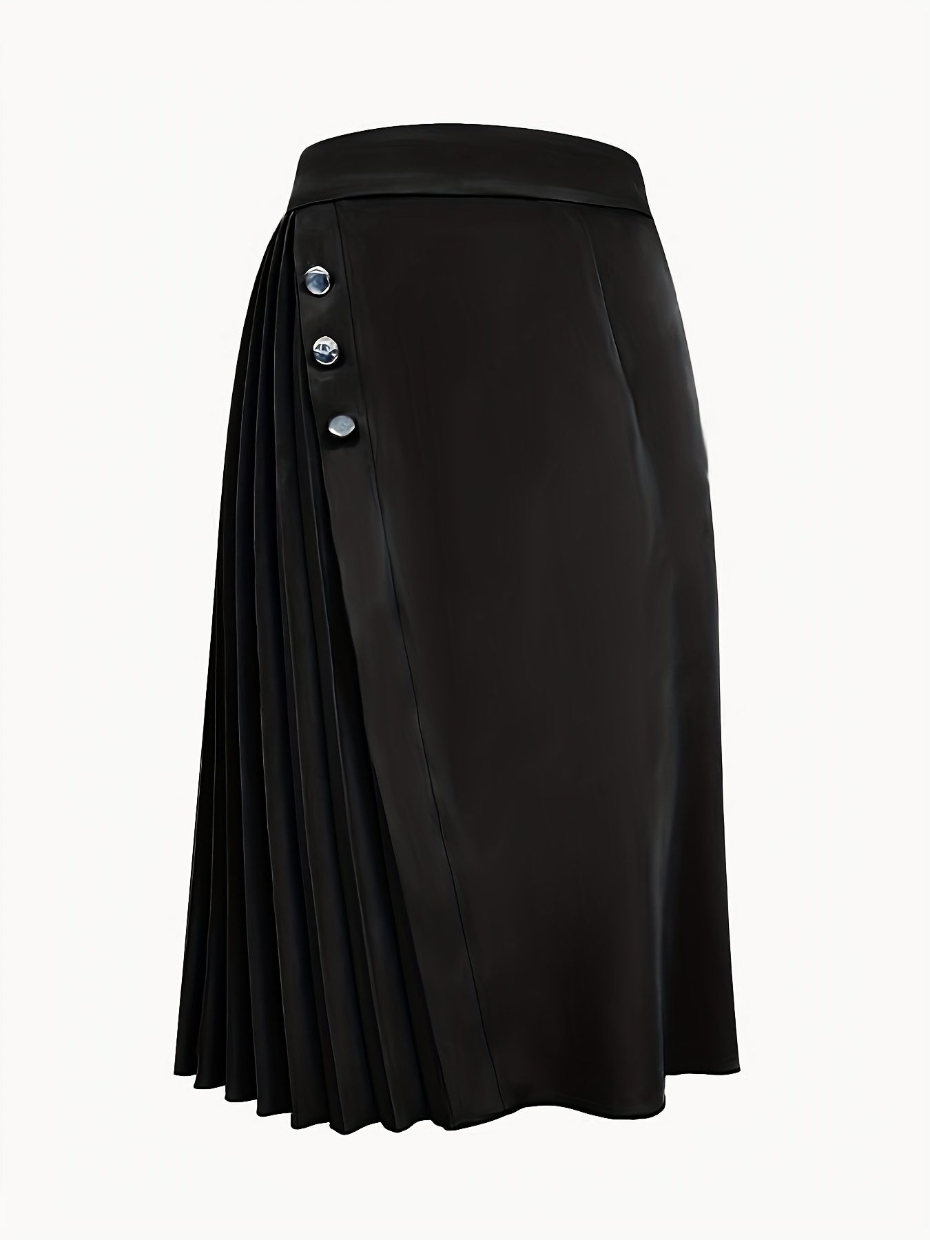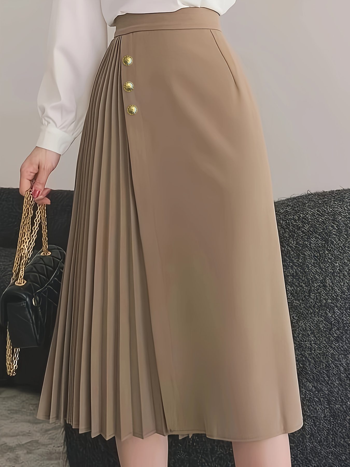 [Highwaisted Elegance] Elegant Beige Pleated Midi Skirt for Women - Chic Asymmetrical Hem with Decorative Buttons, High-Waisted, Polyester Blend, Ideal for Fall Fashion