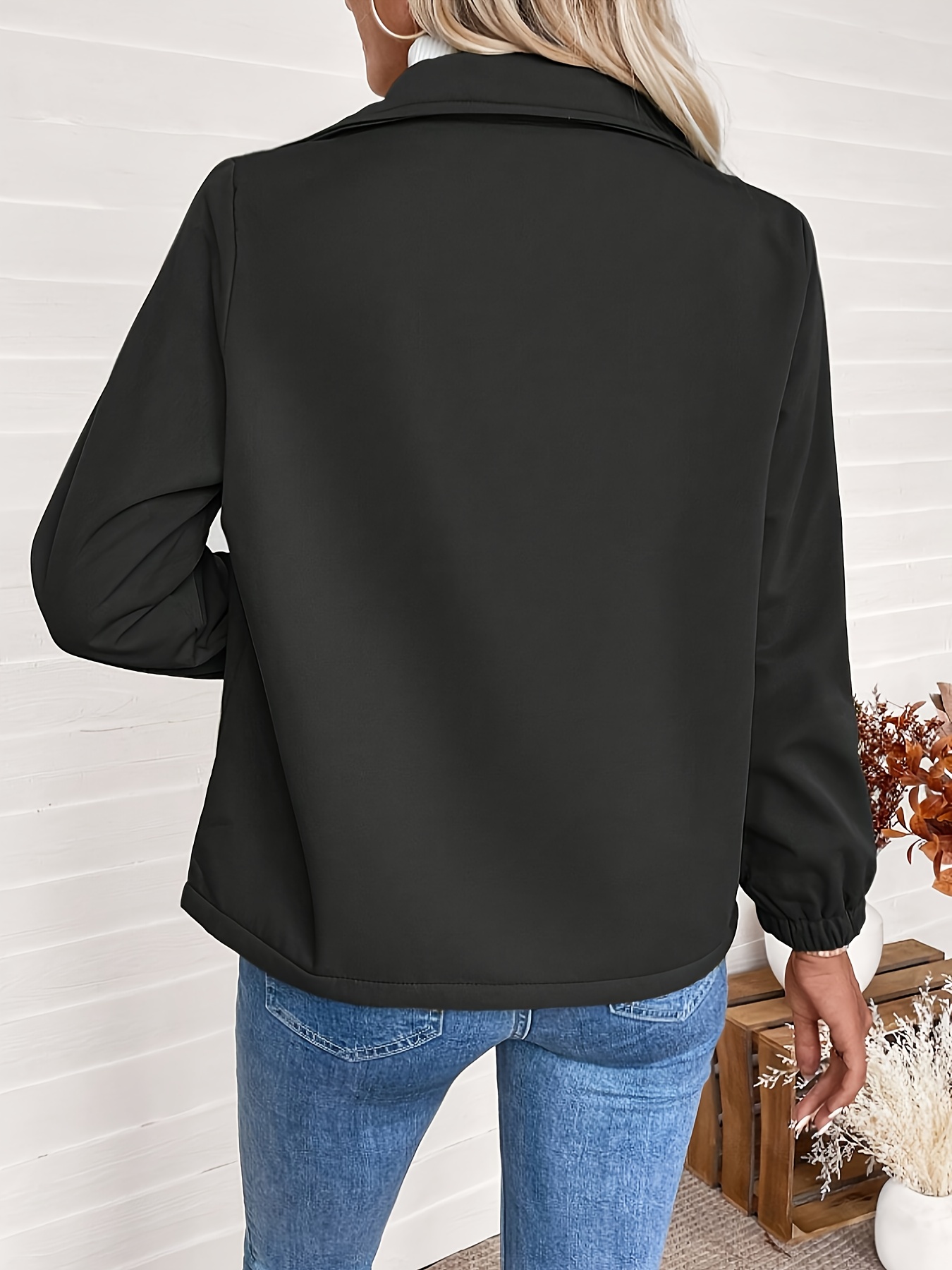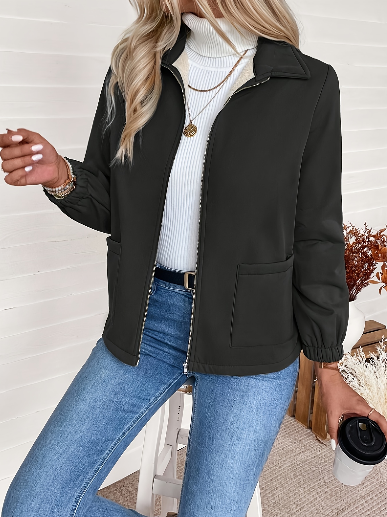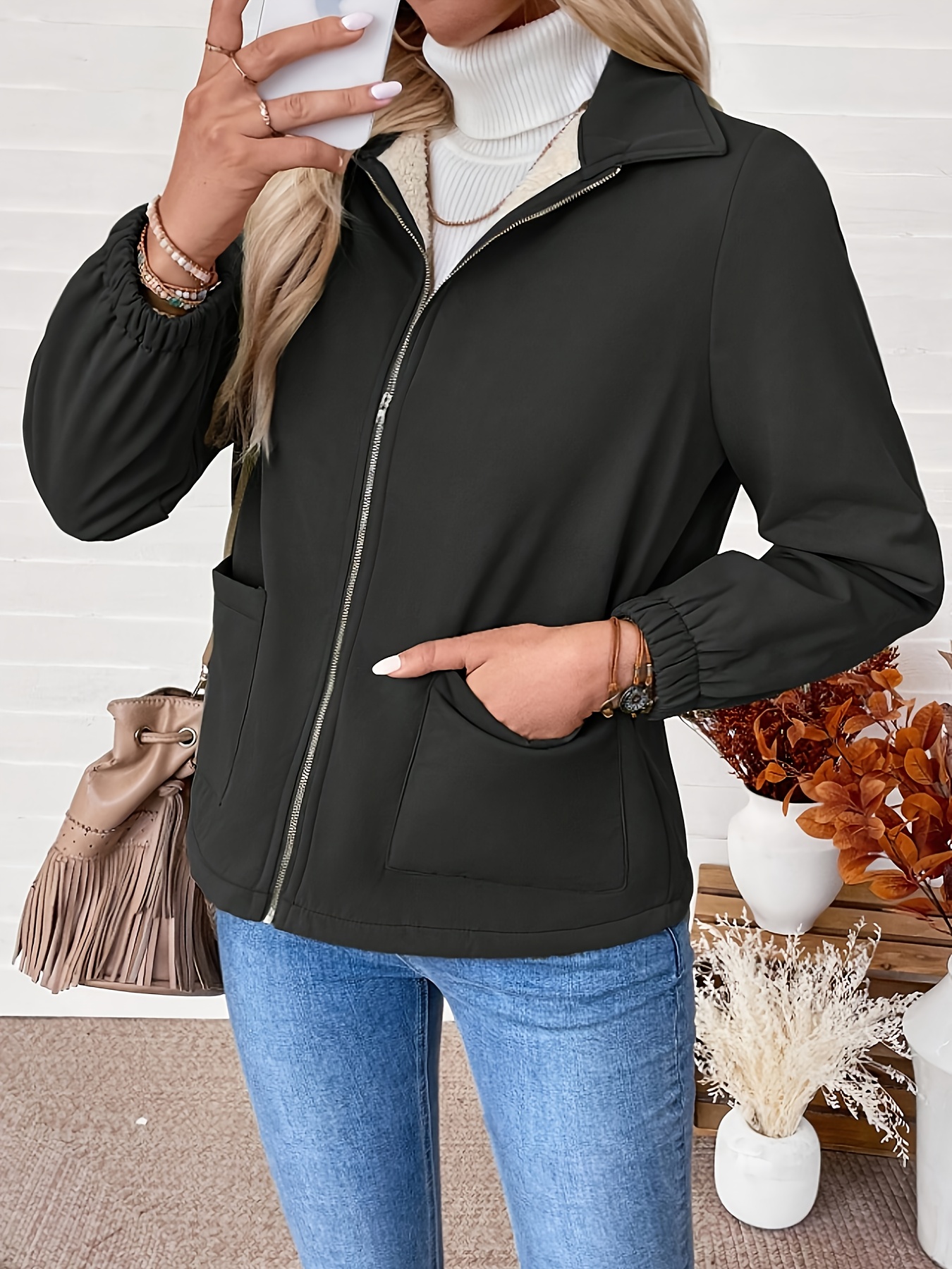 [Solid Color Winter Coat] Women’s Elegant Winter Jacket – Long Sleeve Zip-Up Coat, Black Lapel Collar, Warm Casual Outerwear with Zippered Pockets, Durable Fabric for Fall & Winter