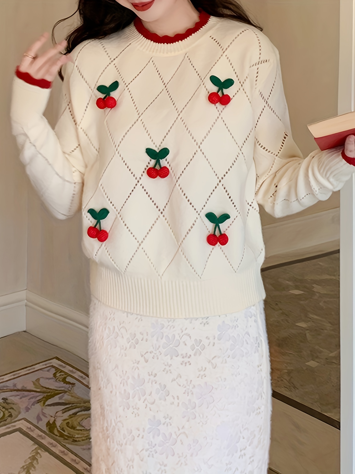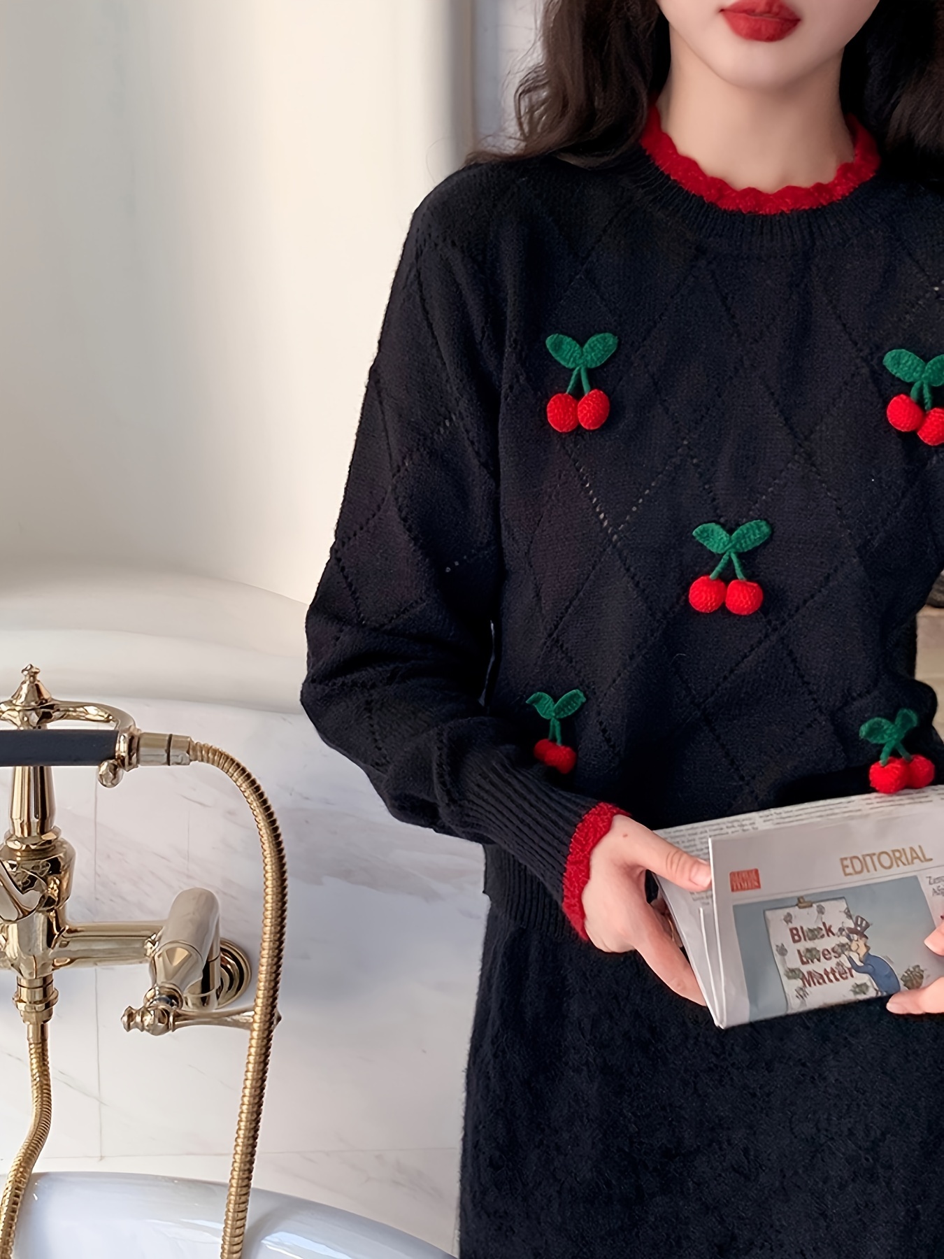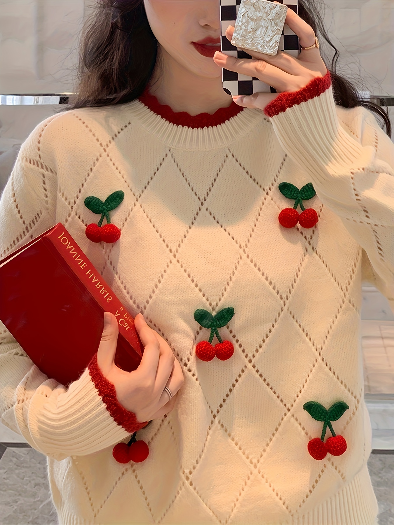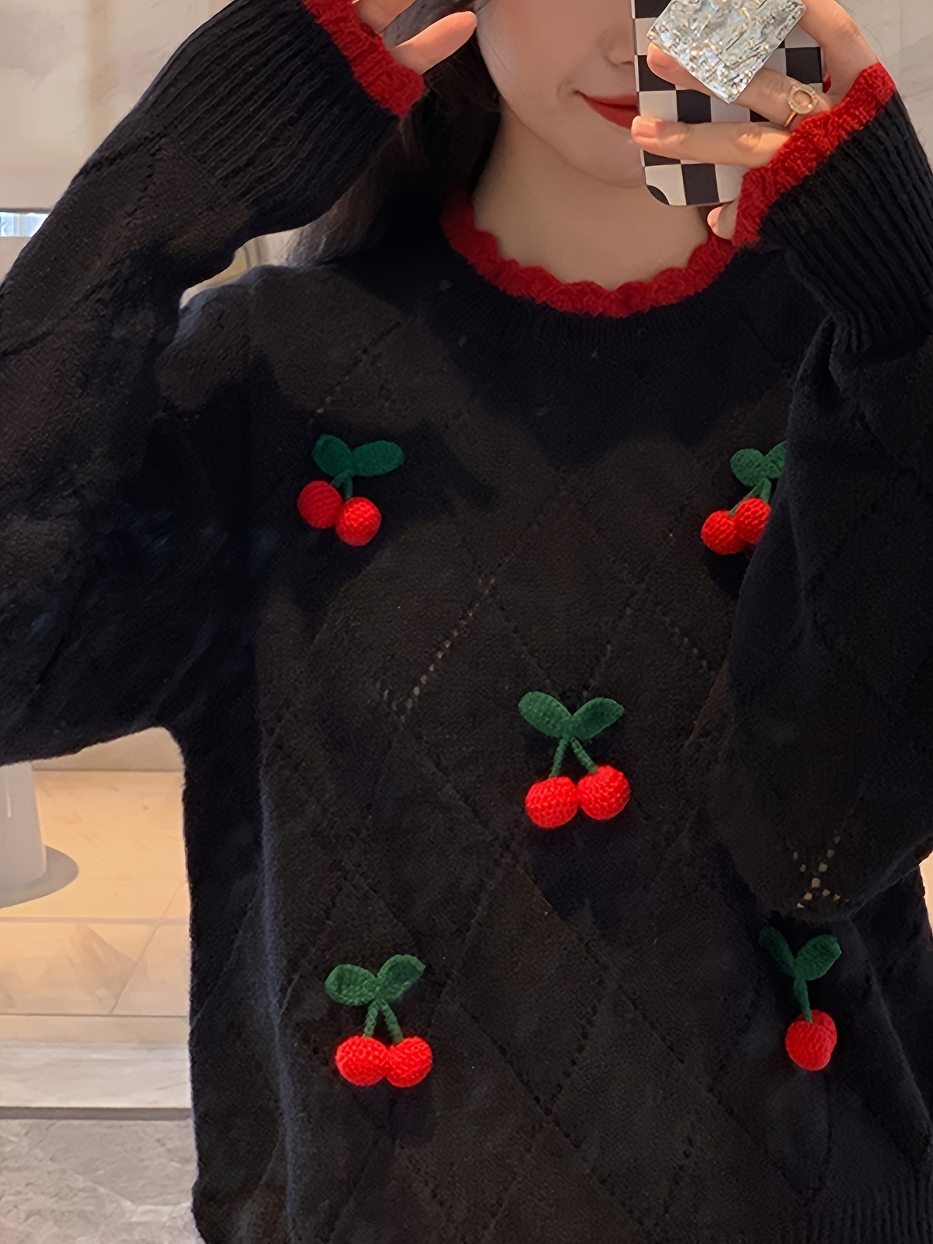 [Stylish Cherry Decor Sweater] Stylish Cherry Decor Contrast Trim Sweater, Crew Neck Long Sleeve Pullover For Fall & Winter, Women’s Clothing
