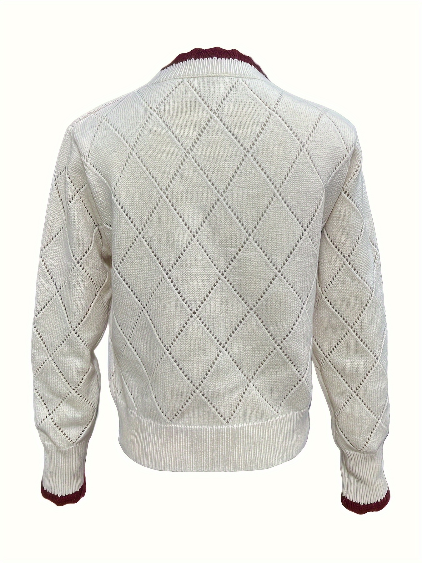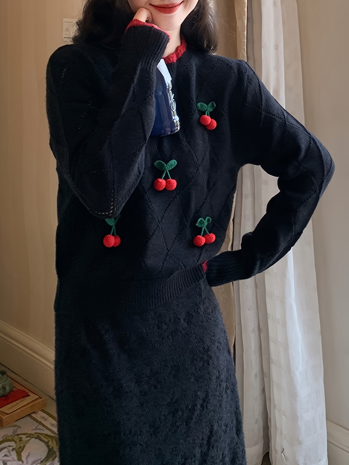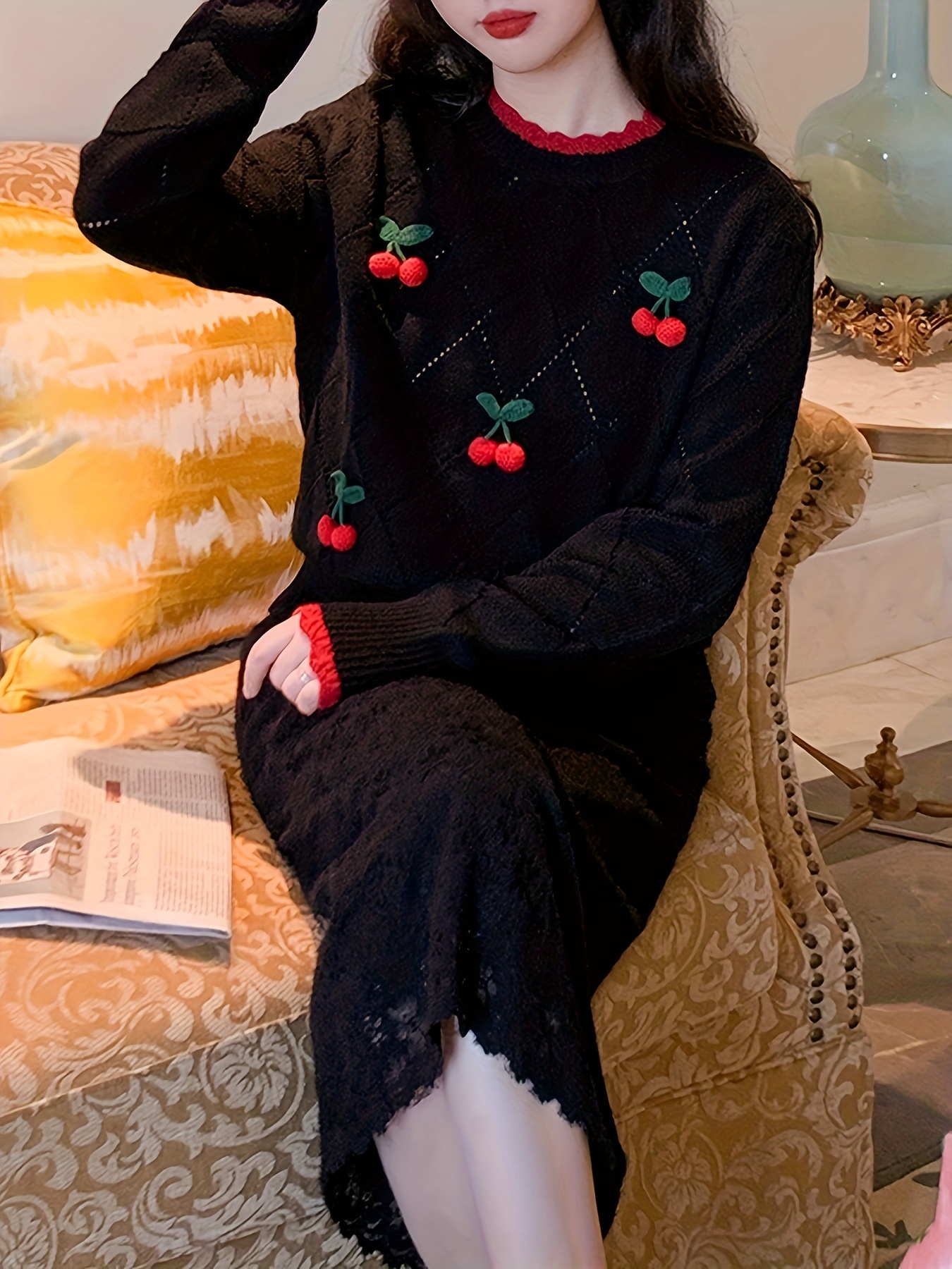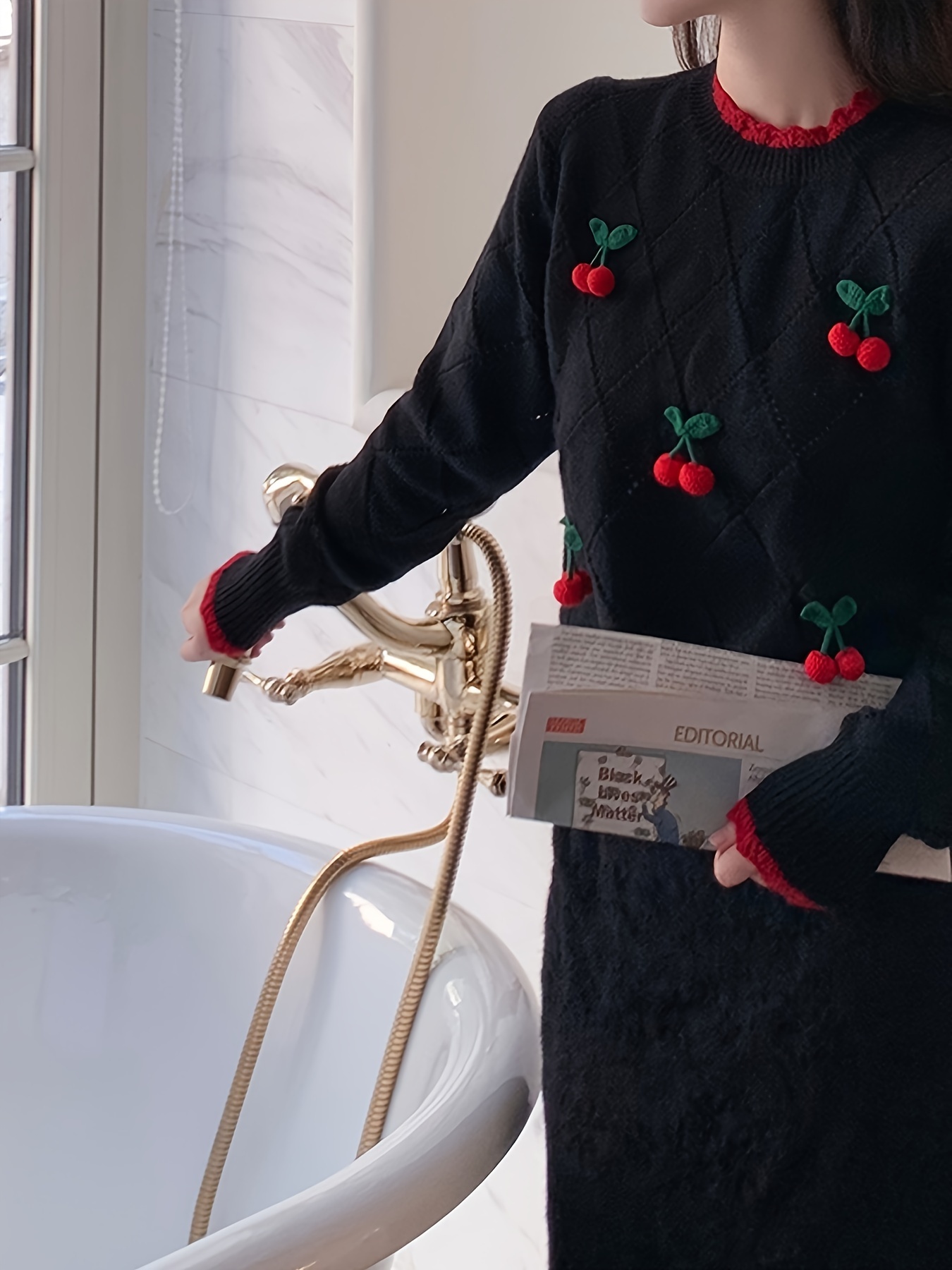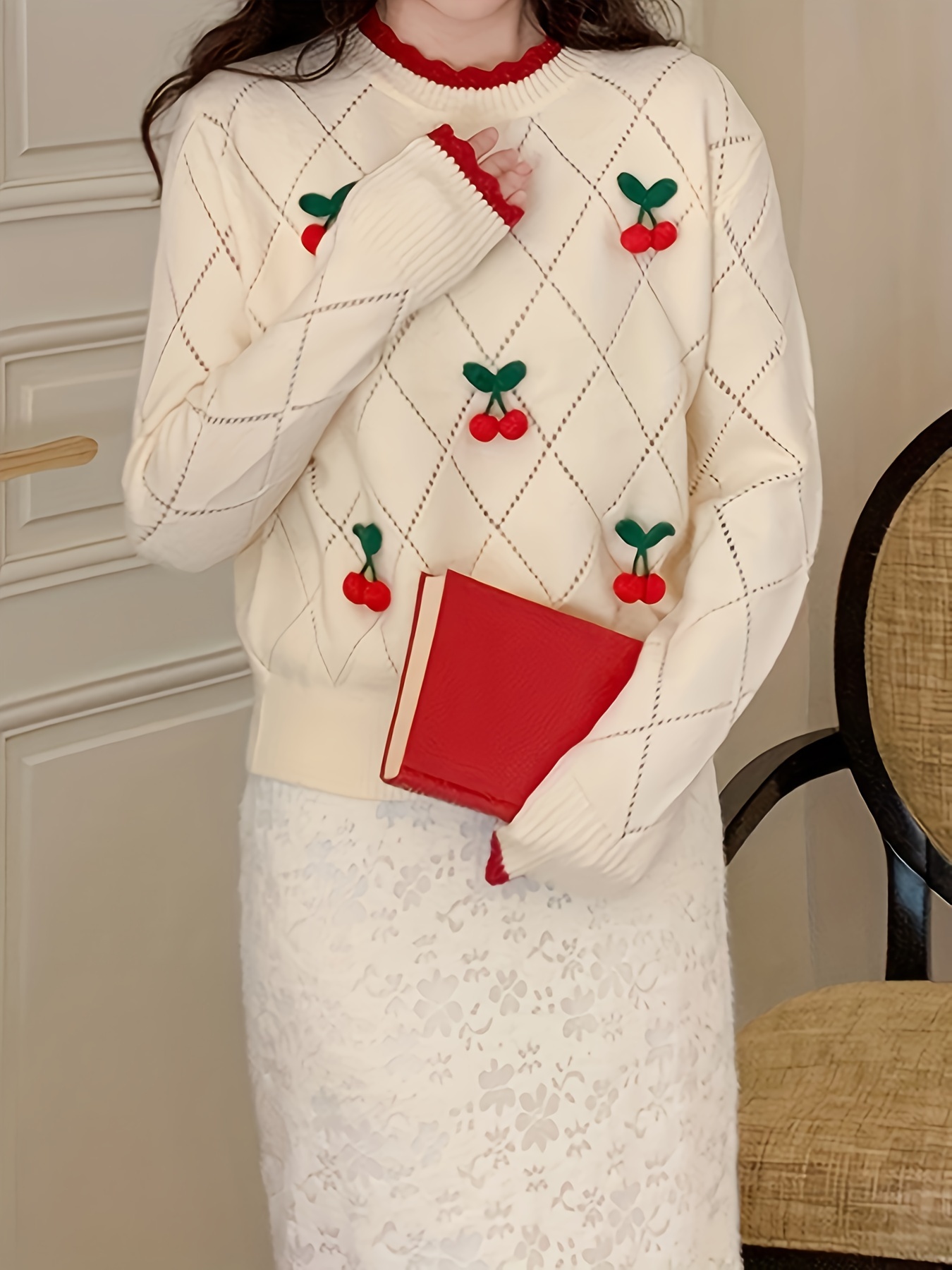 [Stylish Cherry Decor Sweater] Stylish Cherry Decor Contrast Trim Sweater, Crew Neck Long Sleeve Pullover For Fall & Winter, Women’s Clothing