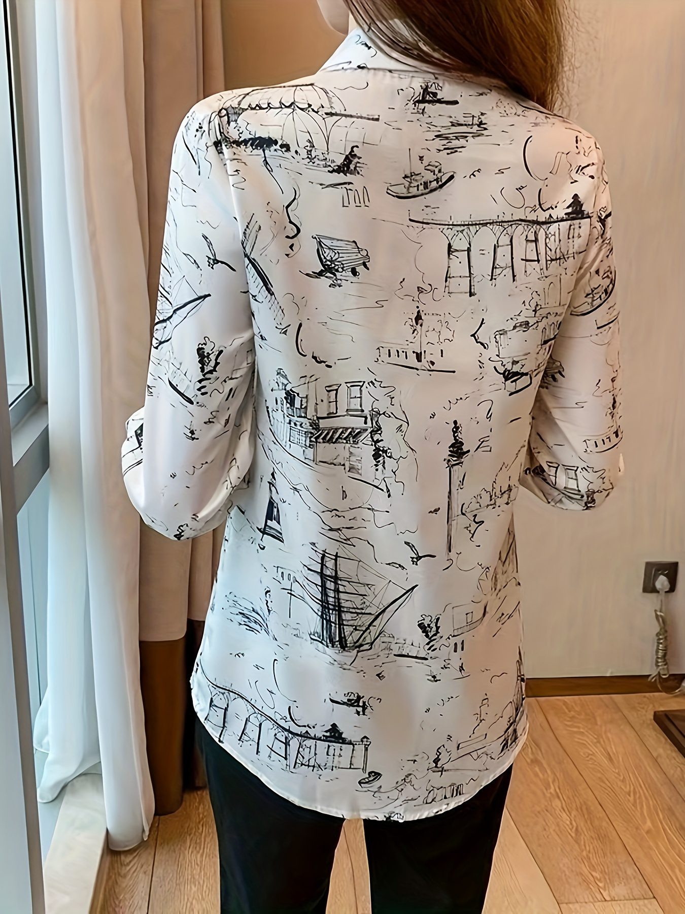 Women’s Elegant Directional Printed Shirt – Black & White Car Pattern, Classic Collar Button-Up Blouse, Machine Washable Spring/Summer Top for Casual & Professional Wear, Summer Outfit, Sophisticated Blouse, Durable Construction, Versatile Blouse, Working Professionals, Spring Fashion, Breathable Material, Stylish Blus, Fashion Lovers