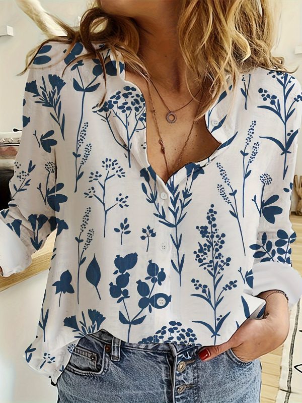 Women’S Floral Print Button-Front Shirt with Blue Floral Print on White – Casual Long Sleeve Turn- Collar, All-Season Versatile Blouse for Everyday & Semi-Formal Wear, Easy-Care Button Front Design, Comfortable & Stylish Women’S Clothing, Blue Floral Long Sleeve Shirt, Blue Floral Blouse For Women, Blue Blouse, Blouse For Women Dressy/casual, Business Casual Outfit/top For Women, Women Top And Blouse, Beautiful Blouse For Women, Elegant Blouse For Women, Shirt For Women, Top For