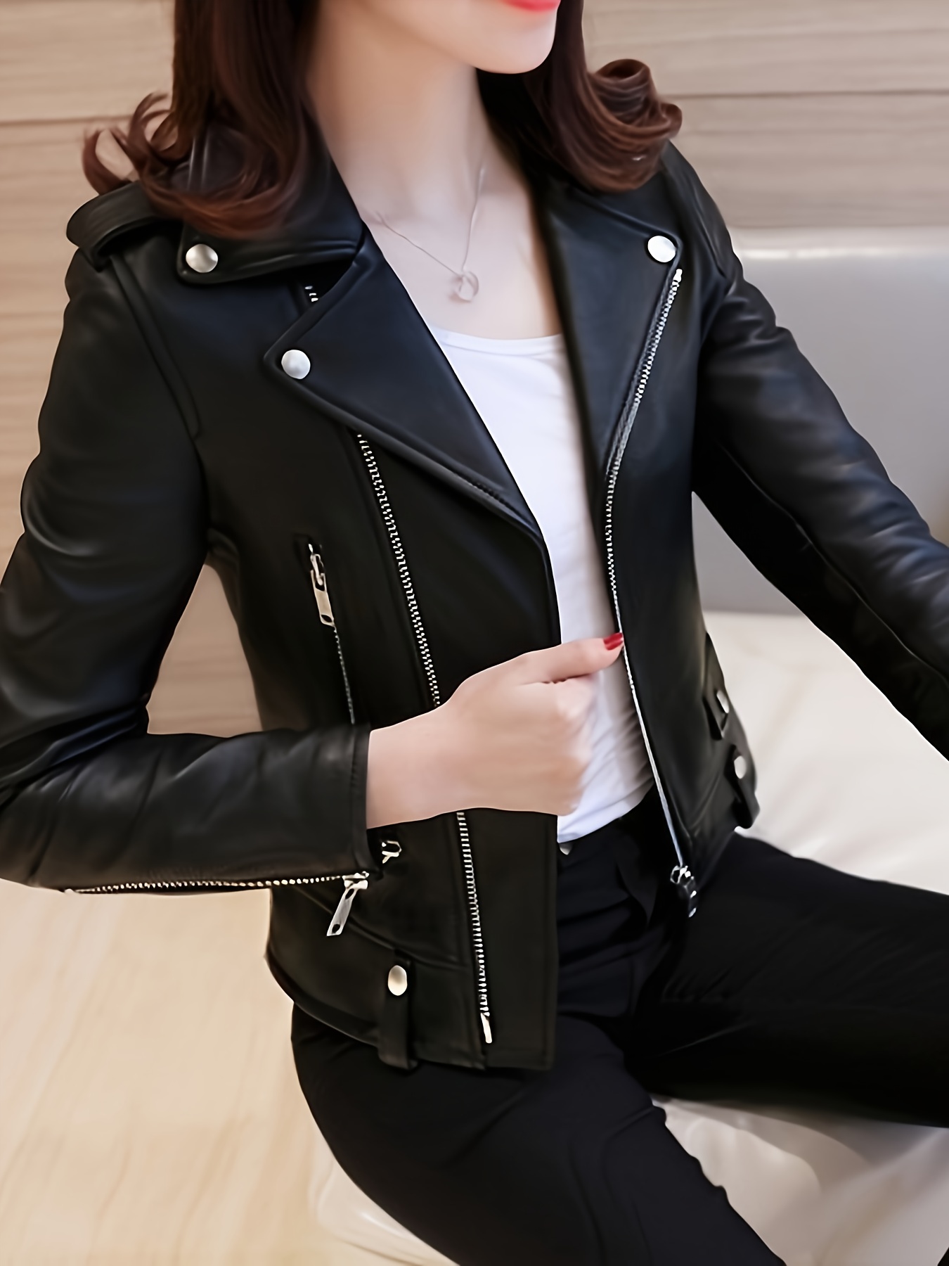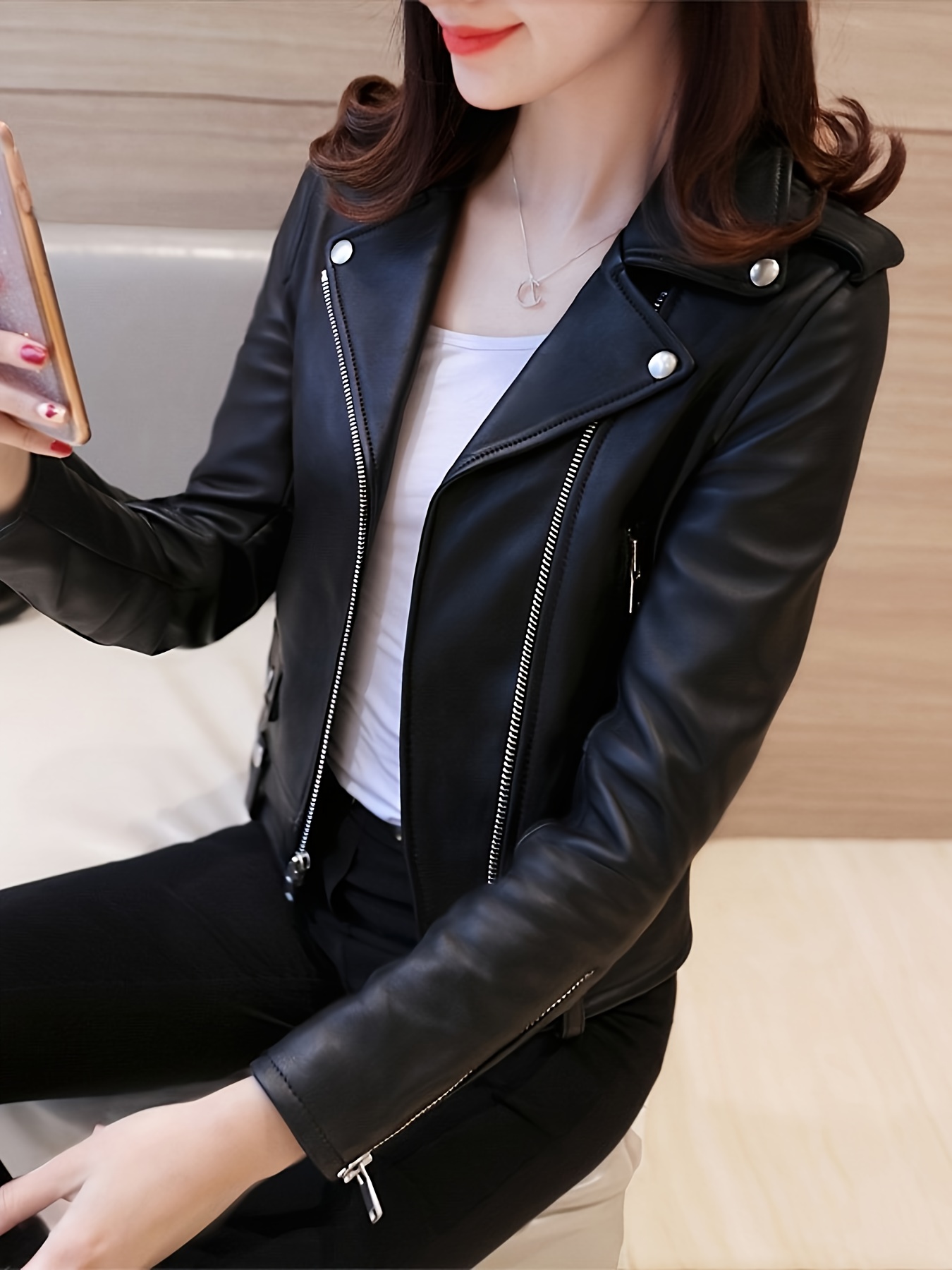 Women’s Jacket Slim Fit Short Motorcycle Jacket – Elegant Black Zipper Front, Machine Washable Spring/Fall Jacket for Casual & Formal Wear