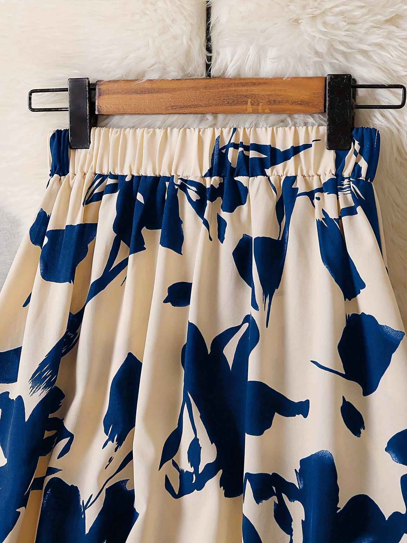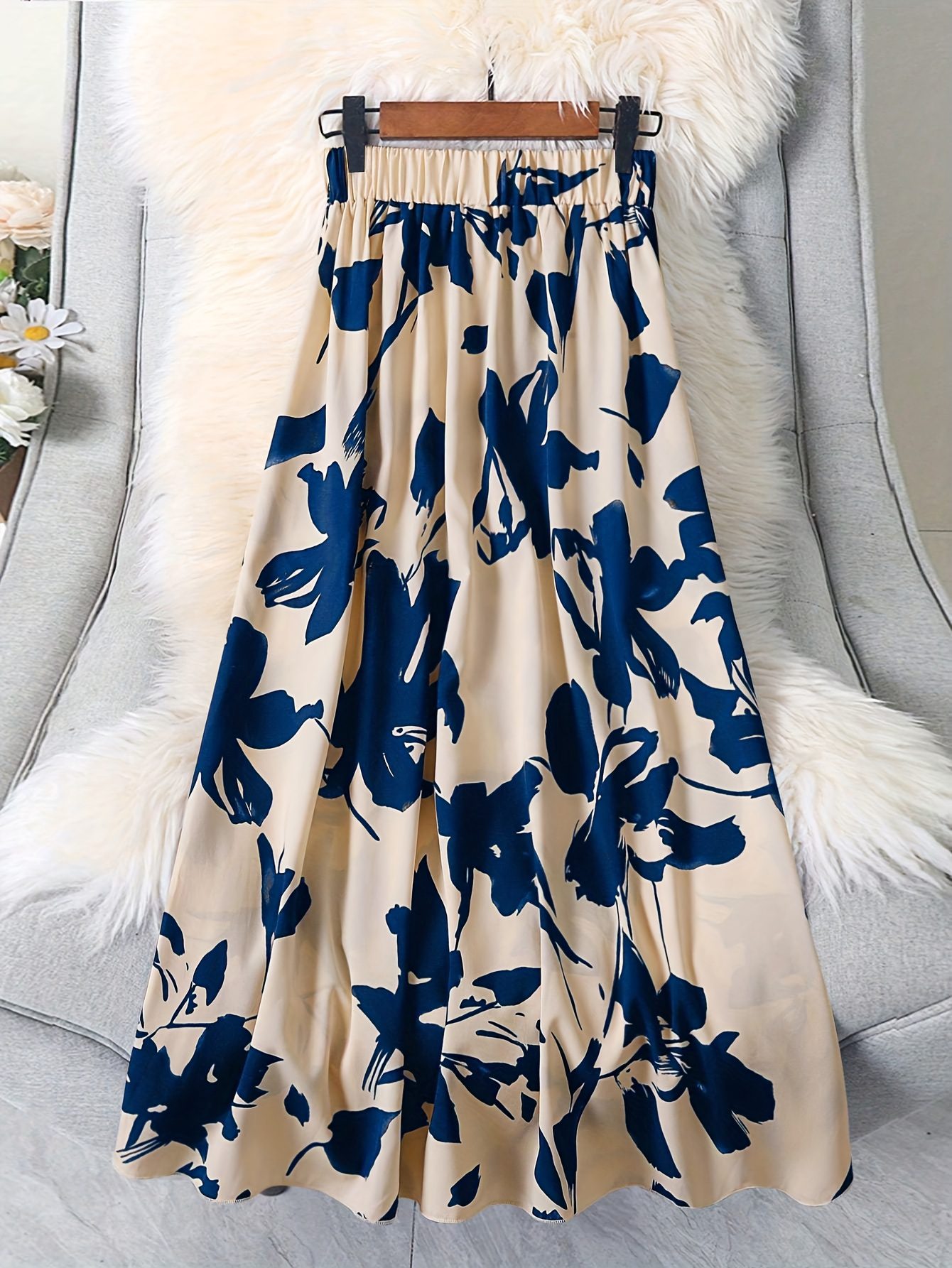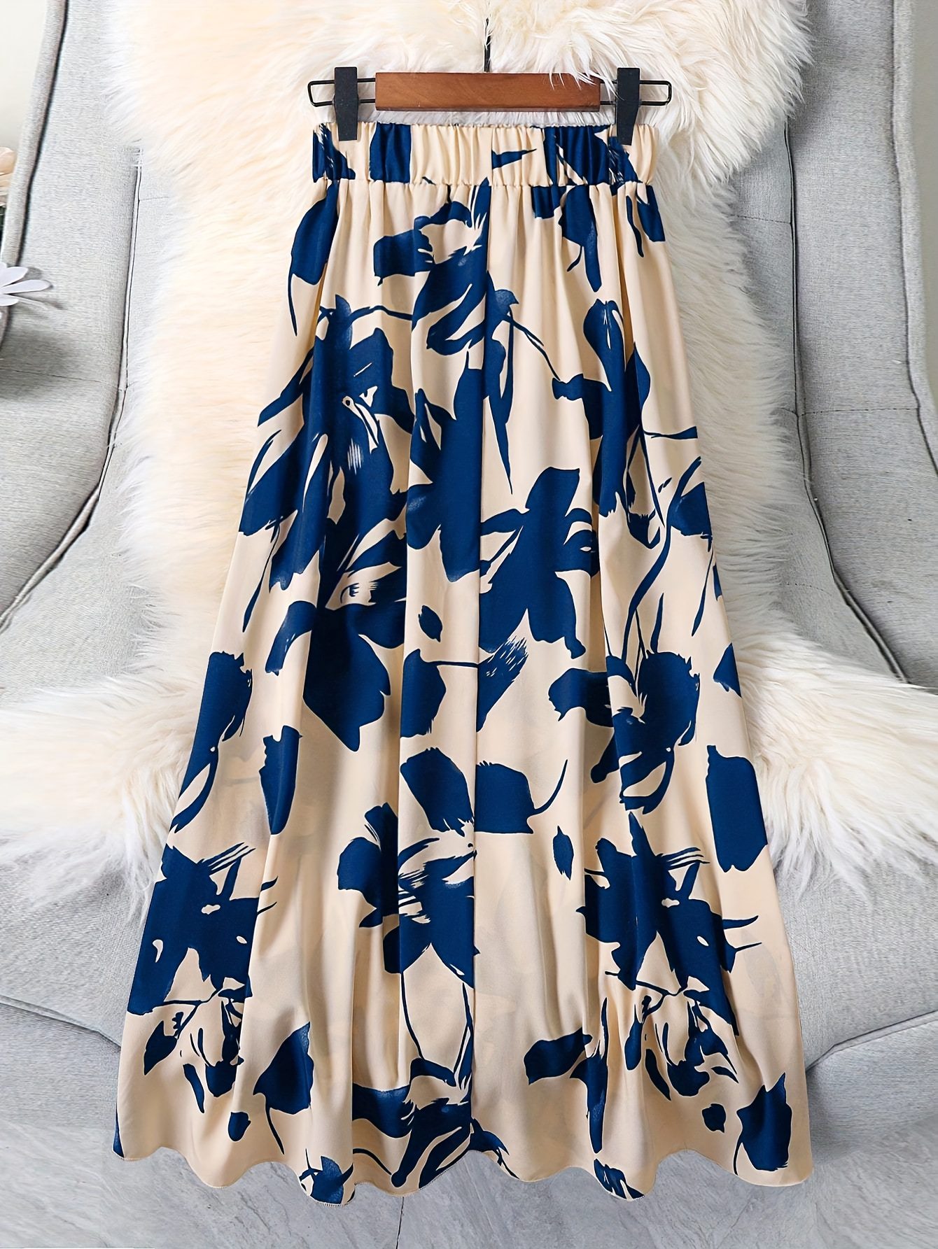 Women’s Navy Blue & Floral Print Maxi Skirt – Elegant A-Line -Length Pleated Skirt with Navy Blue Leaf Pattern, Machine Washable All-Season Formal Wedding Guest Dress or Semi-Formal Attire