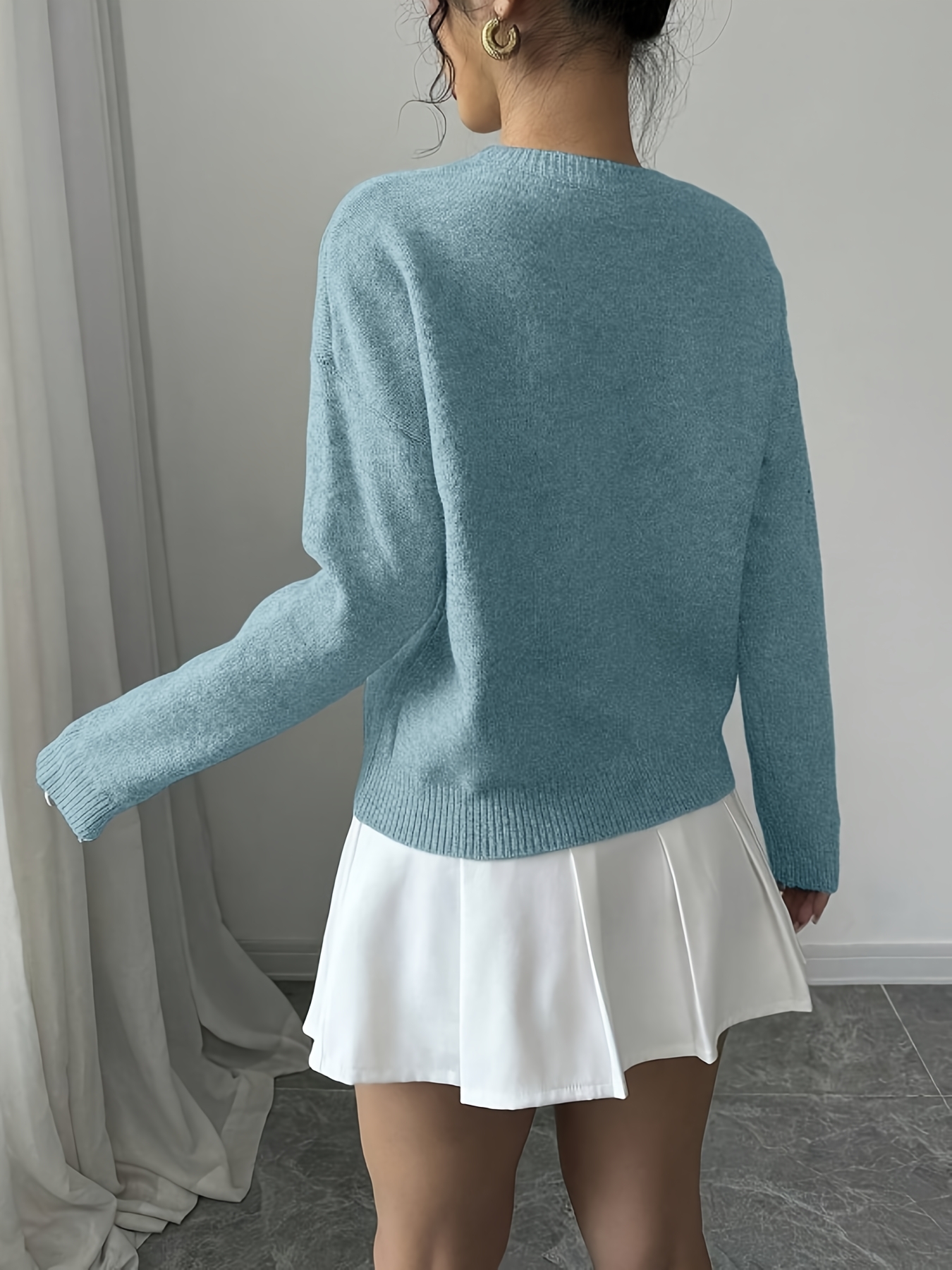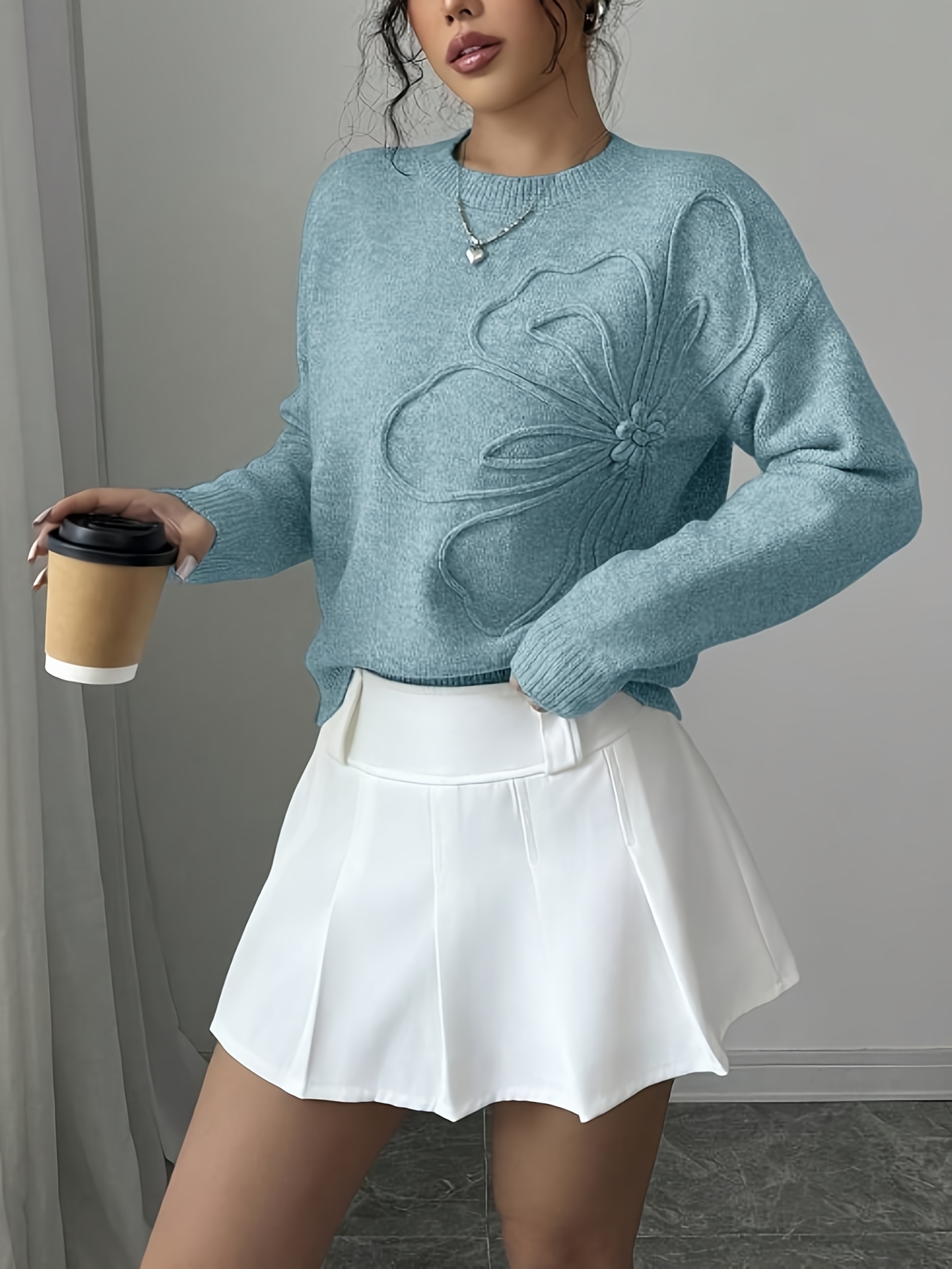 Women’S Y2K Winter Sweater with 3D Floral Appliqué – Light Blue Round Neck Long Sleeve Elegant Pullover, Soft Stretchy Fabric, Regular Fit Casual to Semi-Formal Outfits, Cozy Daily Wear & Special Occasions, Versatile Layering Piece, Comfortable Knitwear, For Fashion Lovers, Winter Clothe For Women